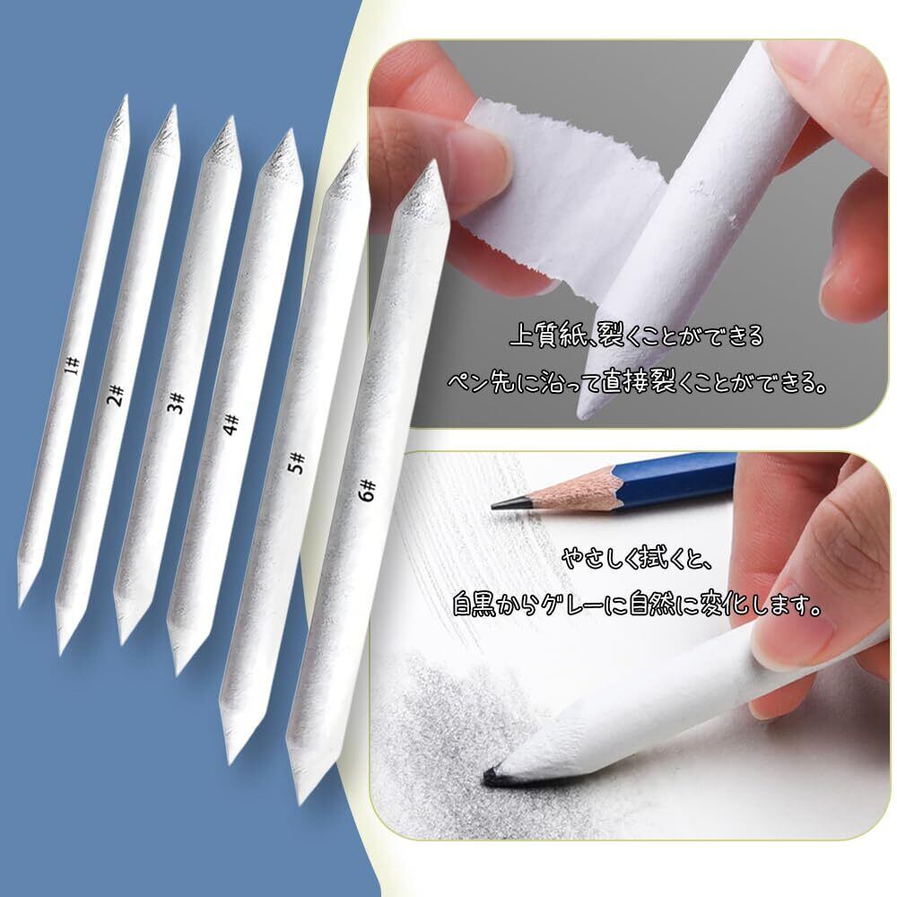 1.【9点セット内容】紙擦筆6本(1〜6号)、大小の両端擦筆2本、調整に便利なサンドペーパー1枚を含むスケッチ用道具セット 2.【幅広い用途】鉛筆・木炭・パステルなどの描画に使用でき、ぼかしや陰影の表現を自然に仕上げるのに最適です 3.【両端尖りデザイン】両端が尖った擦筆は、細かい部分の描き込みや柔らかいぼかしに役立ちます 4.【6サイズ対応】1号〜6号の紙擦筆を揃え、細部から広範囲のぼかしまで様々な表現に対応できます 5.【耐久性のある素材】硬く巻かれた高密度紙を使用しており、適度な硬さで型崩れしにくく、繰り返し使用が可能です