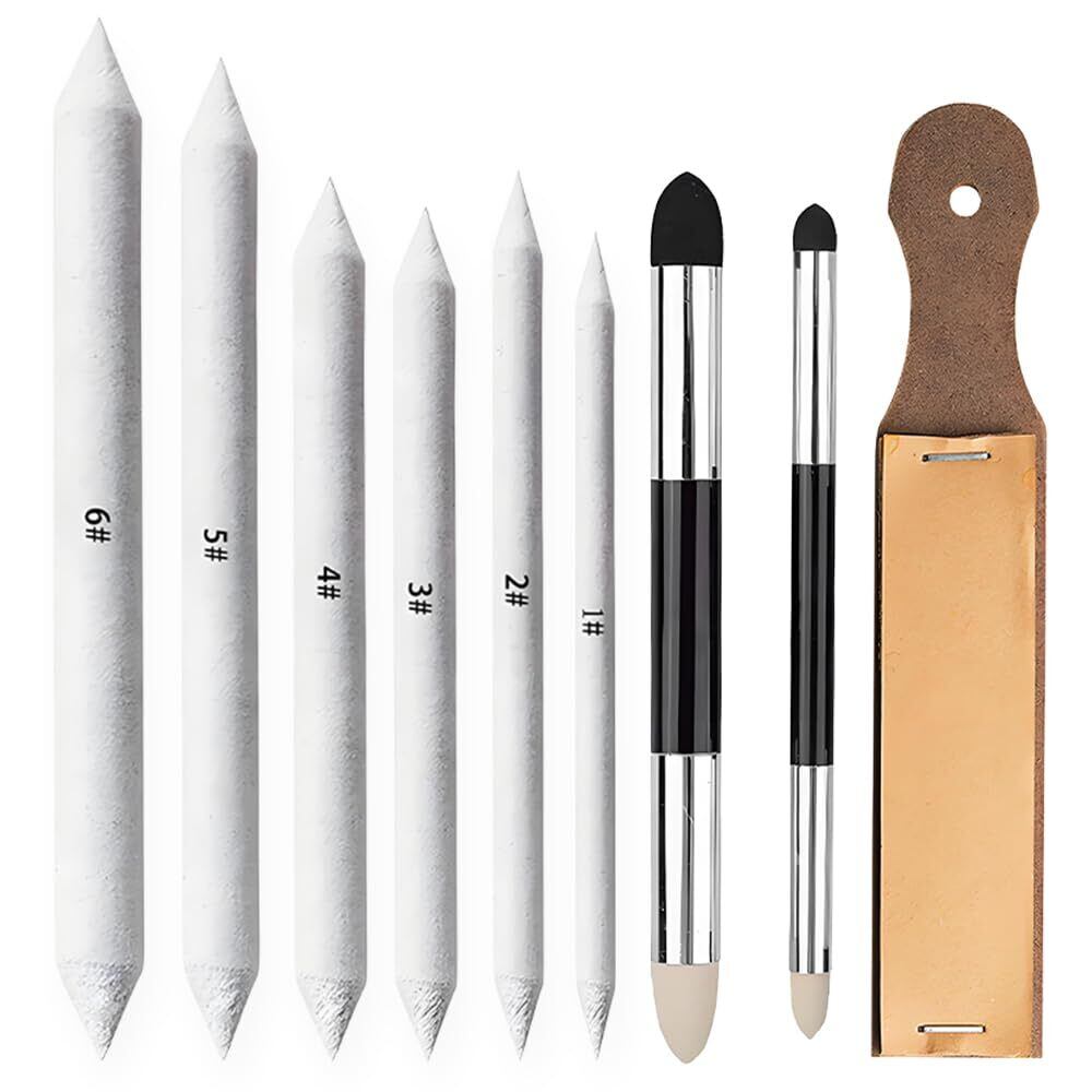 【9点セット内容】紙擦筆6本(1〜6号)、大小の両端擦筆2本、調整に便利なサンドペーパー1枚を含むスケッチ用道具セット