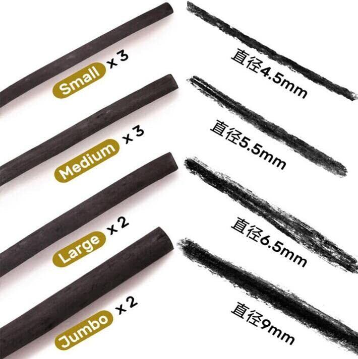 10本セット:9㎜*2本、6.5mm*2本、5.5㎜*3本、4.5㎜*3本 という太さの異なる4種類の木炭スティックセットです。用途に応じて太い線も細い線も描き分けられて、よい絵描き気分です。
