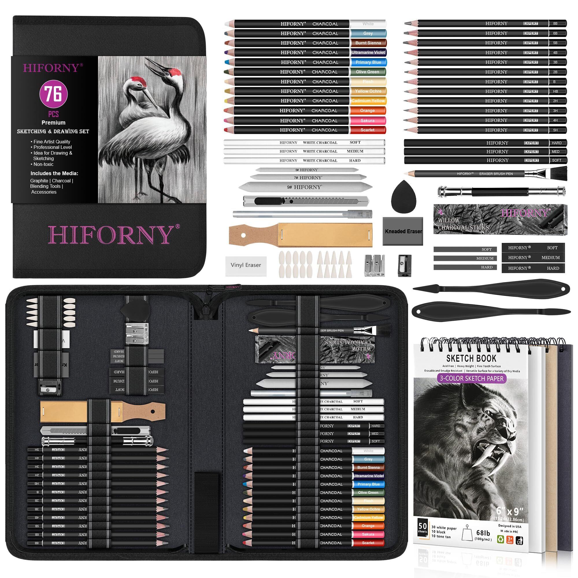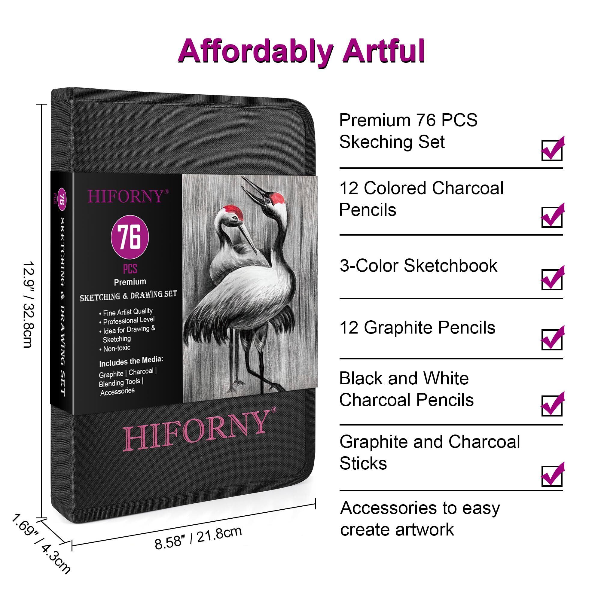 HIFORNY 76個 プロフェッショナル グラファイト チャコール ドローイング用品鉛筆セット、あなたの芸術的才能を探求するために必要なものがすべて揃った万能で包括的なスケッチセット。 プロのアーティスト、初心者、アーティストへのギフトをお探しの方でも、このキットでカバーできます。