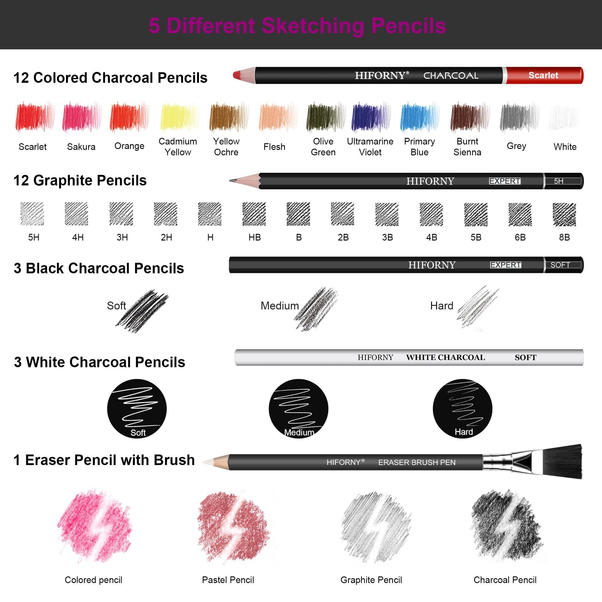 完全な描画用鉛筆セット:HIFORNY 76個のスケッチと描画キットには、プレミアムグラファイト鉛筆12本(8B、6B、5B、4B、3B、2B、HB、2H、3H、4H、5H)、色炭鉛筆12本、黒炭鉛筆3本、白炭鉛筆3本、ブラシ付き消しゴム1本、柳チャコールスティック4本、グラファイト3本、チャコールスティック3本が含まれます。 s。 各鉛筆には明確なラベルが付いており、簡単に選択できます。スケッチ、シェーディング、ブレンド、レイヤリングに最適です。