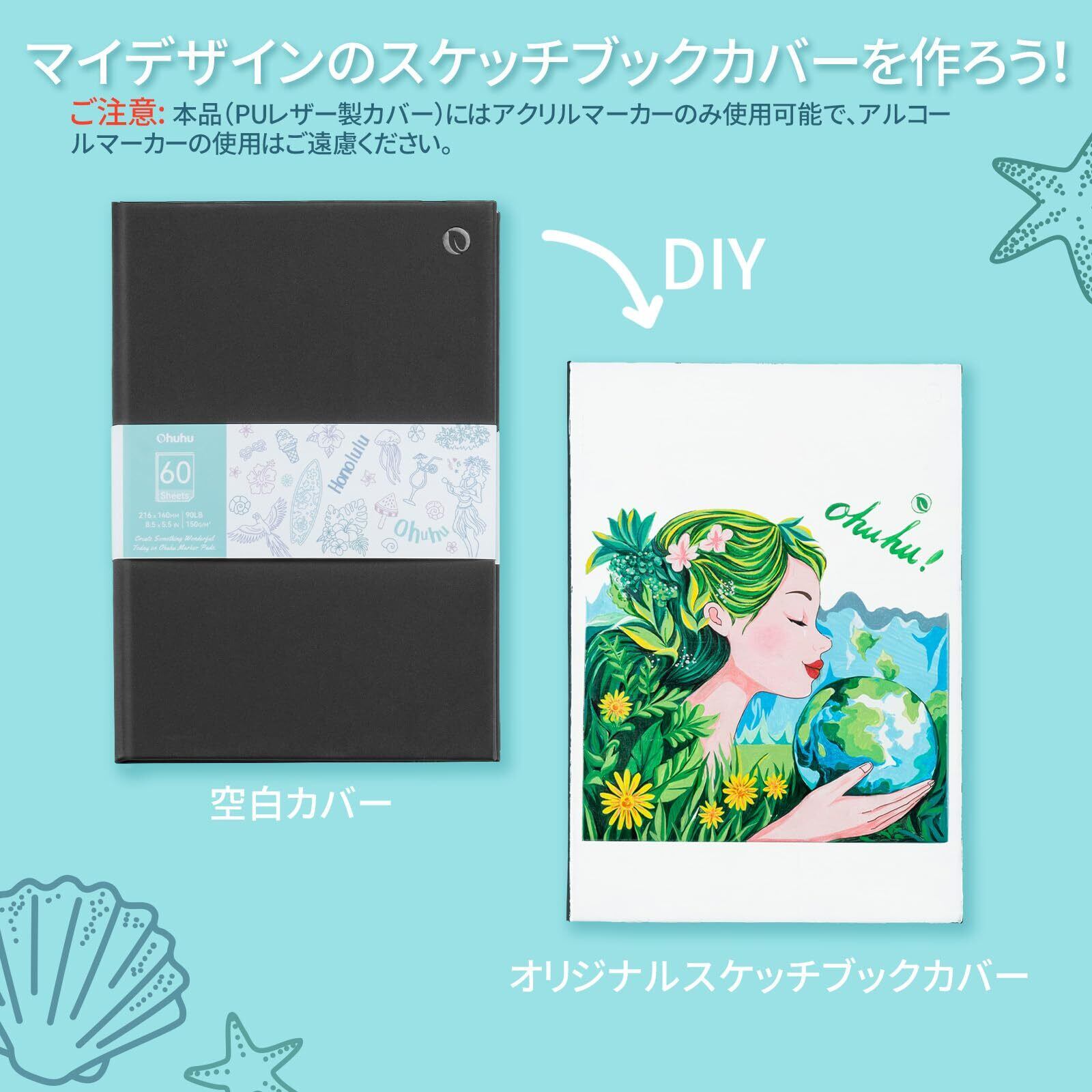 Ohuhu スケッチブック マーカーペン用 140mmx210mm 画用紙 裏写りしない 150gsm 表裏両面使用可能 60枚/120ページ ミシン目付き 黒カバー スケッチ イラスト 落書き メモ 塗り絵 誕生日 クリスマス プレゼント