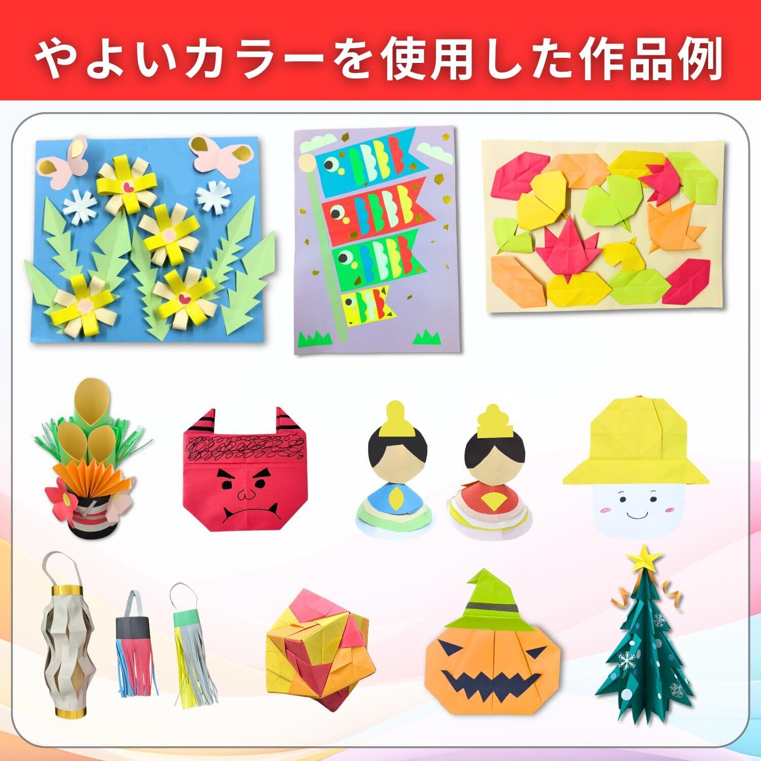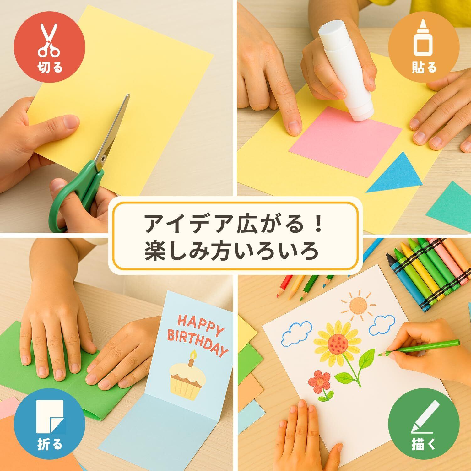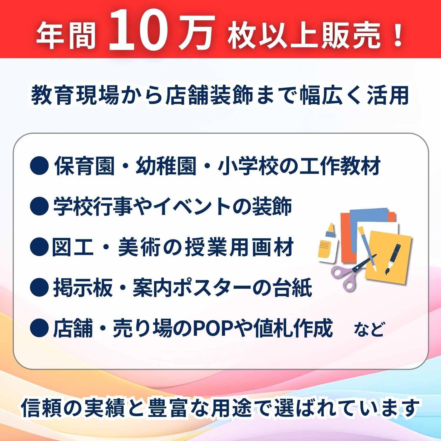 主な用途:学校教材や図工・美術の工作、壁面装飾や掲示物、季節行事やイベント演出に加え、家庭での遊びや学習にも幅広く活用できる色画用紙。