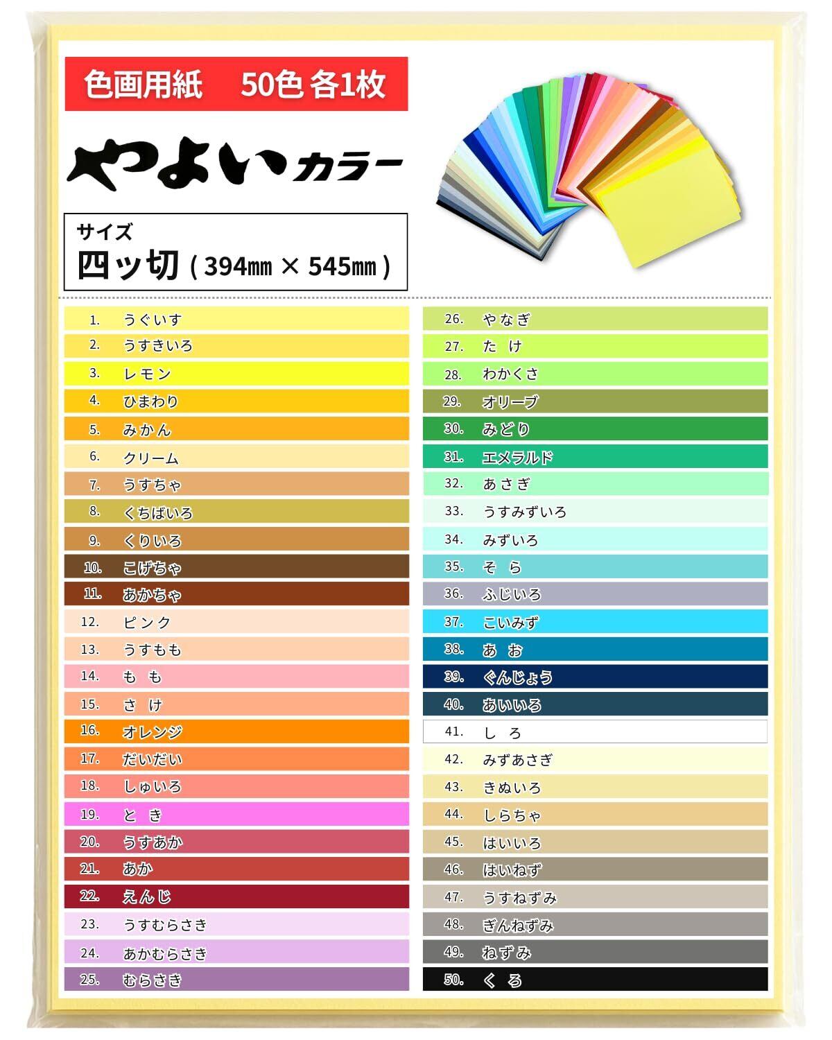 四つ切 色画用紙 394×545mm やよいカラー 50色×各1枚 日本製 適度な厚み 紙厚約0.19㎜ 工作 教材 装飾に最適 保育園 幼稚園 小学校から大学まで幅広く導入済 年間10万枚以上の販売実績 田村商店オリジナルパック 全色セット 50枚入