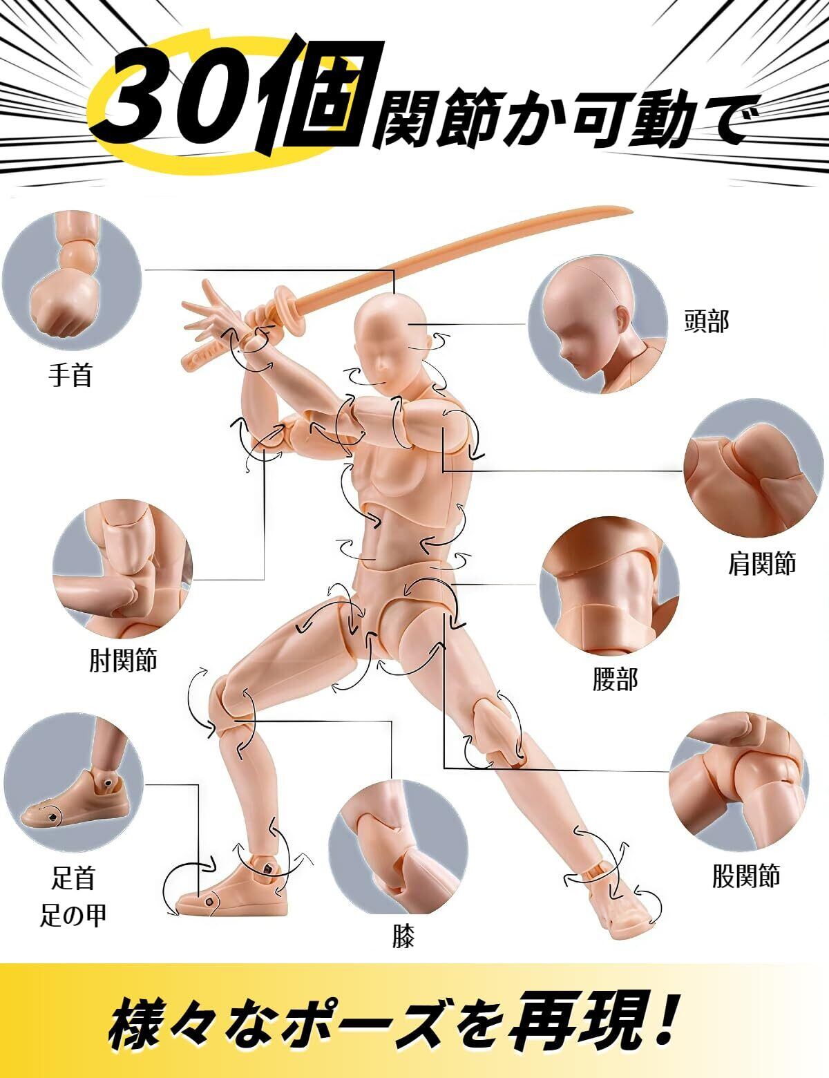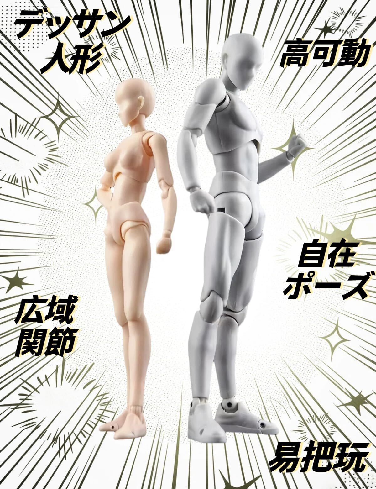 【改良版!30個関節が可動】ご要望の多いリクエスト(バリが目立つ、関節がゆるゆる、パーツの交換が難しい、硬くて動かしにくい)にすべてお応えました!!ヘッド、胸、腰、肩、肘、手首、膝、足首など全身の30ヵ所以上が可動し、自由自在に手足を曲げる事ができる、目的のポーズやアクションが簡単に再現、様々な角度から観察してデッサンすることが可能。人形の関節は可動式なので、好きな姿勢に変形でき、人体の姿勢を研究するのに役立ちます。