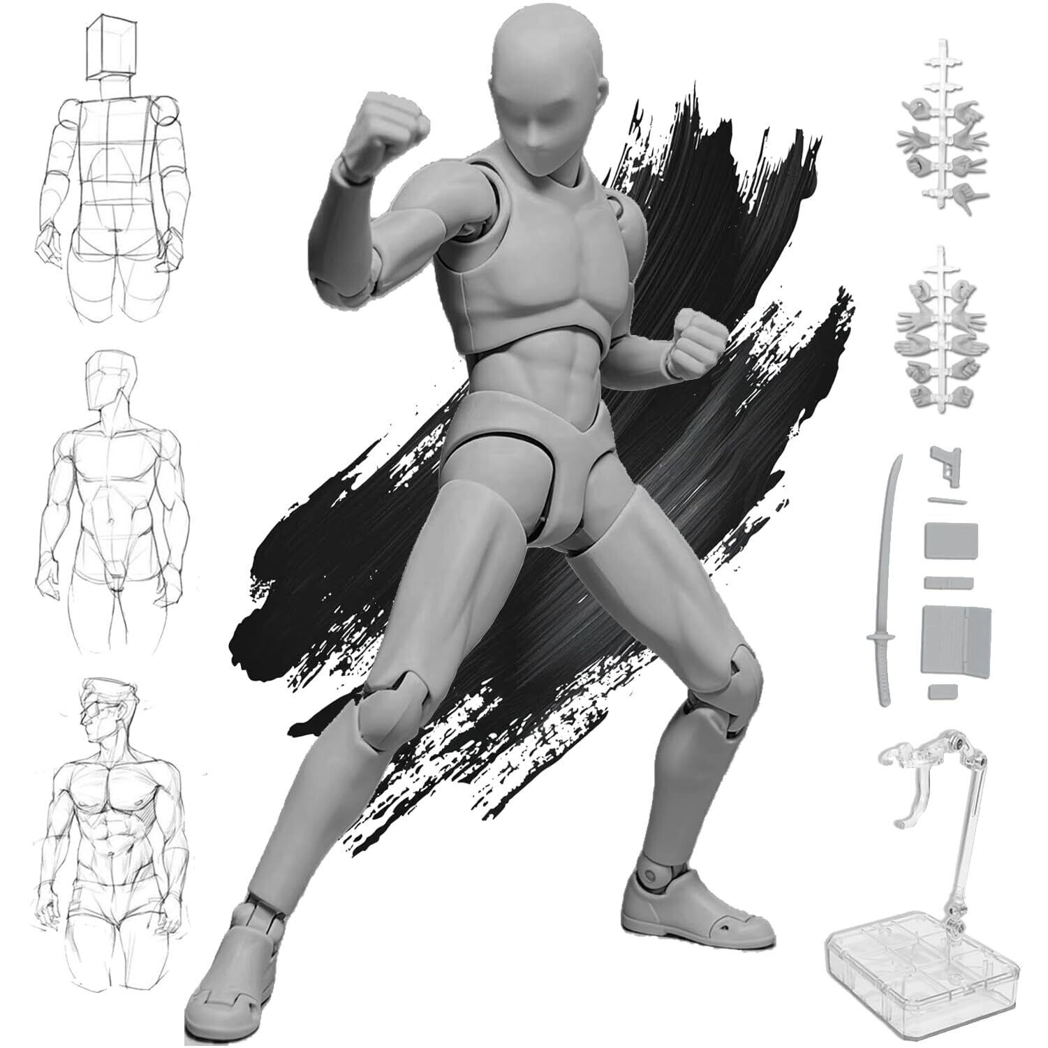 デッサン人形 関節可動30ヶ所 ポーズ人形 男性&女性モデル スタンド付き 漫画・美術用 筋肉表現可能 デッサンドール スケッチモデル フィギュア 作画練習 美術教材 プロ用 可動式素体 ポージング(男性-グレー, ONE SIZE)