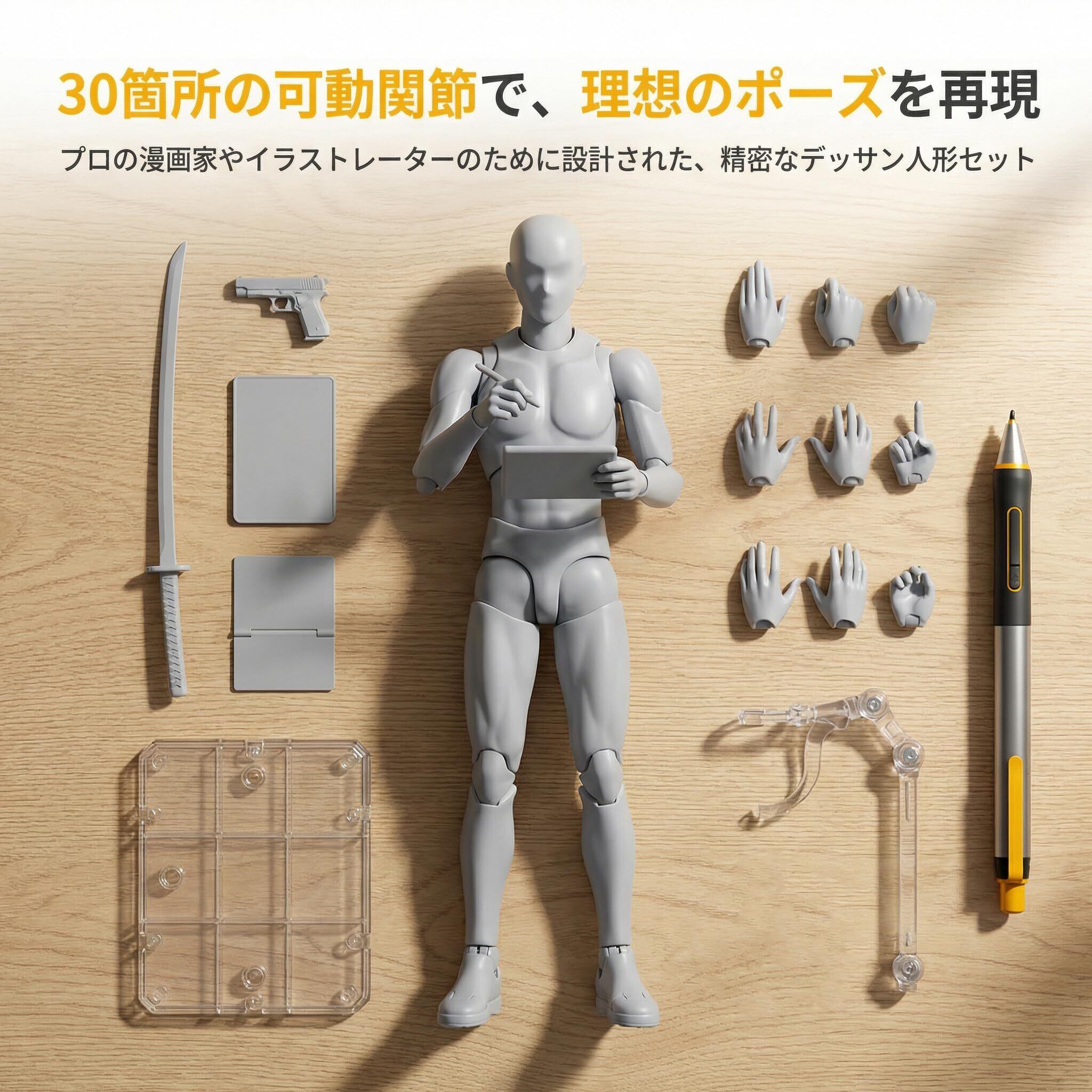 【人気商品】デッサン人形 関節可動30ヶ所 ポーズ人形 男性&女性モデル スタンド付き 漫画・美術用 筋肉表現可能 デッサンドール スケッチモデル フィギュア 作画練習 美術教材 プロ用 可動式素体 ポージング(男性-グレー, ONE SIZE)