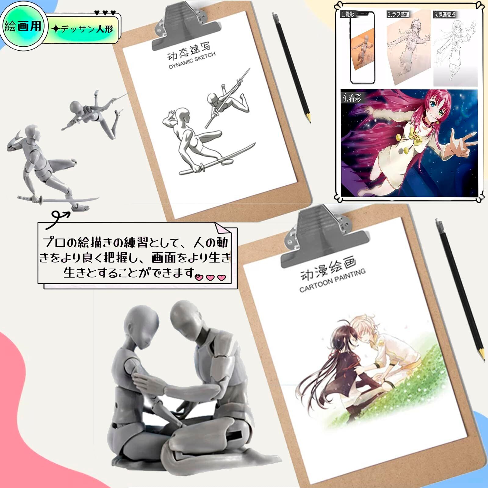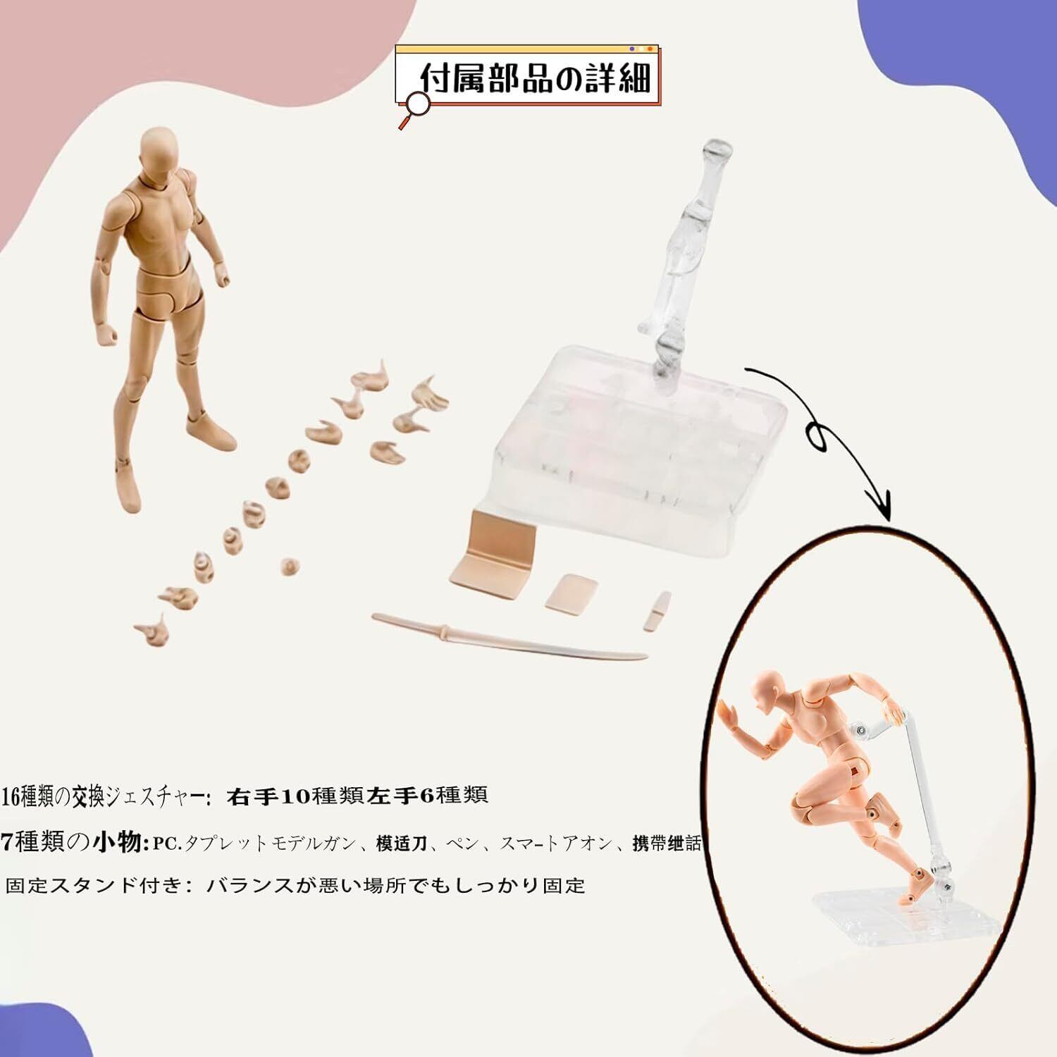 【全身改良版!圧倒的な30可動関節】 「バリの目立ち」「関節の緩さ」「パーツ交換の難しさ」「可動の硬さ」といったお声に応え、改良を重ねました!!全身30ヶ所以上の関節にこだわり、あらゆるポーズを再現。あなたの思い通りにポーズを決められ、あらゆる角度からの観察とデッサンを可能にします。男性モデル:全長約14cm、女性モデル:全長約13cm。対象年齢:15歳以上