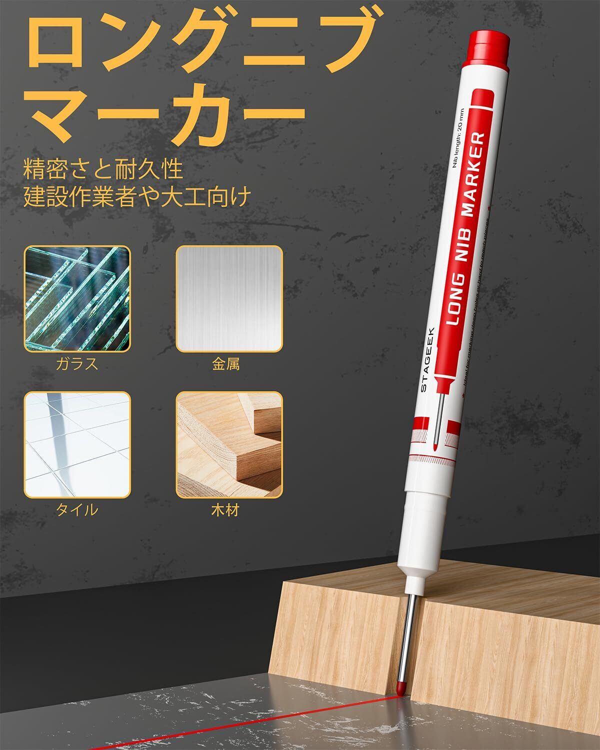 【深穴マーキング用マーカーペン】 ロングチップ&防水仕様のマーカーペンは、ガラス・金属・プラスチックなど、通常の建築用シャーペンでは対応が難しい素材へのマーキングに最適です。あらゆる素材に正確に描けるため、セットの汎用性をさらに高めています。