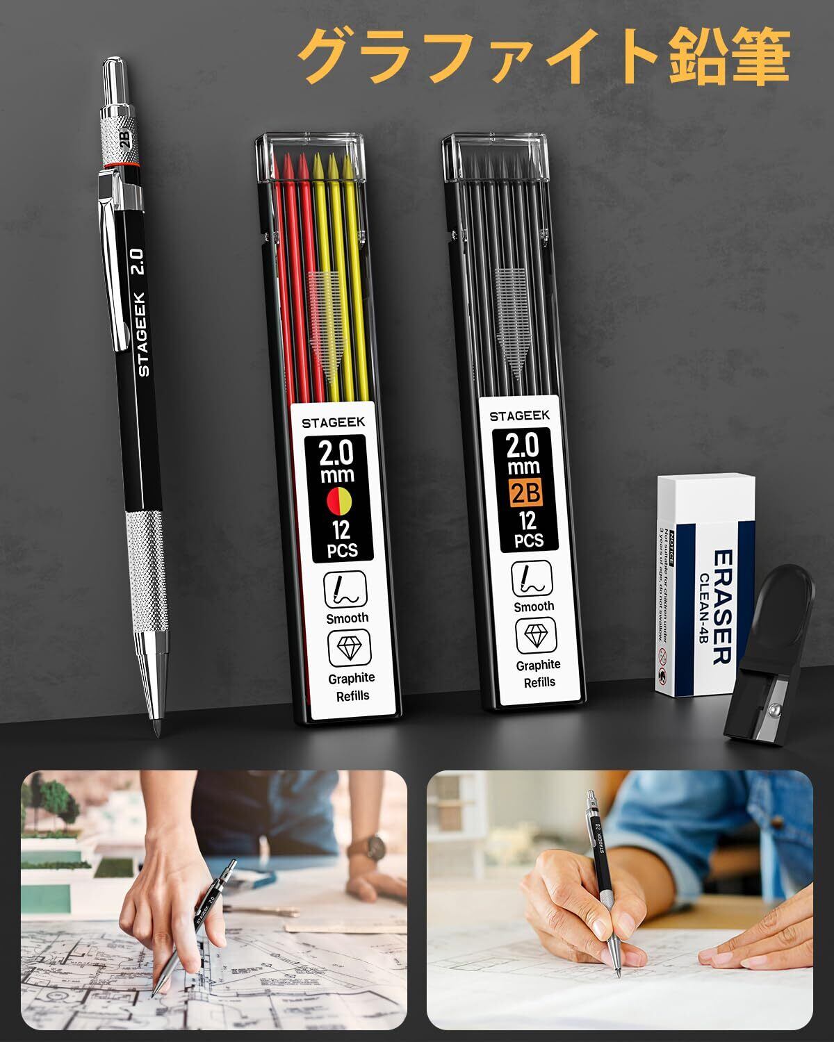 【高品質な金属製シャーペン】 耐久性に優れた2.0mm製図用シャーペンは、筆記や図面作成に最適で、特に工学設計に最適なパートナーです。金属製のグリップは滑り止め加工が施されており、手にしっくりと馴染むバランスの取れた重さで快適に使用できます。セットには複数の芯カラーも含まれており、用途に応じた使い分けが可能です。