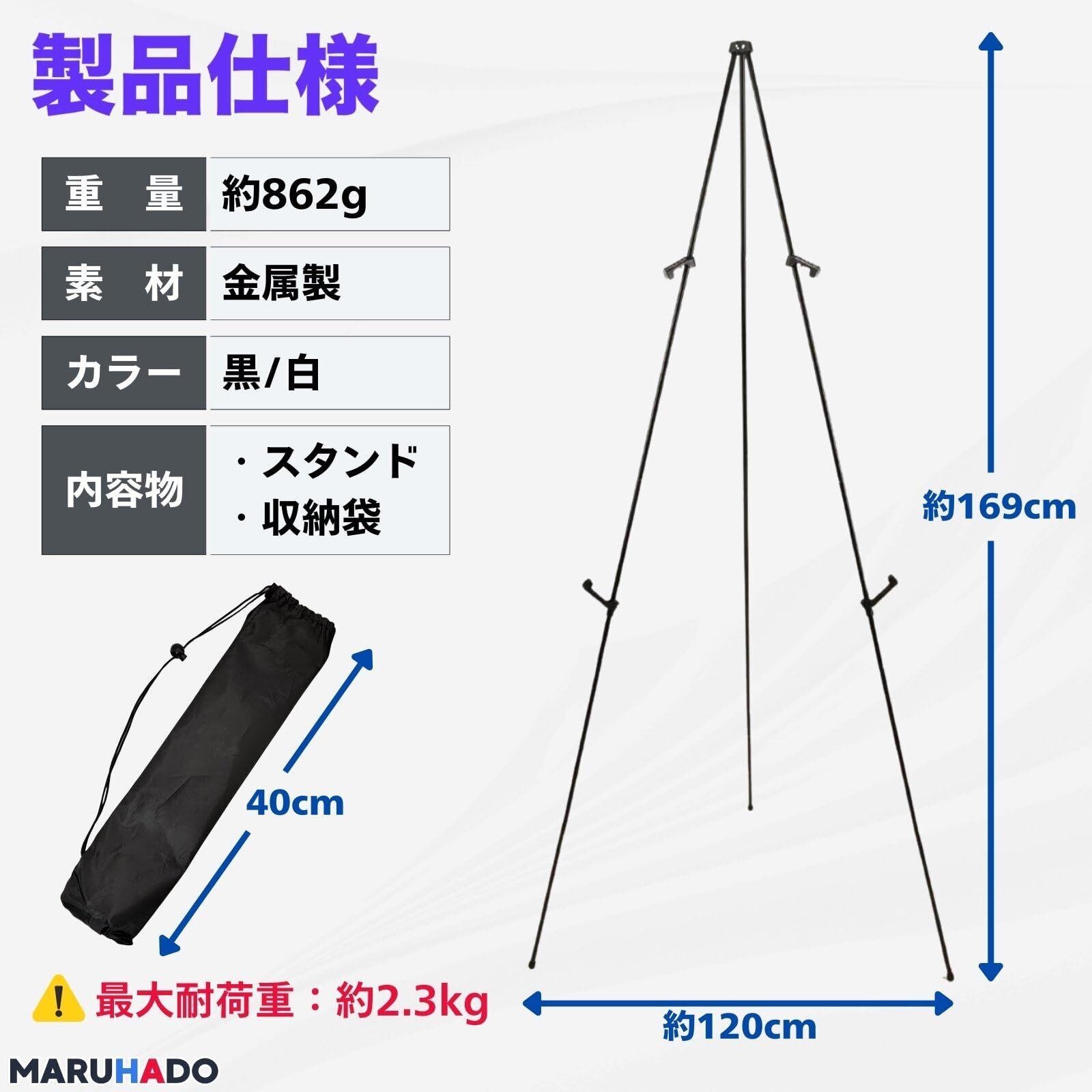 【商品内容】イーゼル本体、収納袋 【材質】合金製 【耐荷重】約2.3kg 【サイズ】組立時:長さ約169cm、幅約120cm 折り畳み時:長さ約38.5cm 重量:862g 【カラー】ブラック(黒)、ホワイト(白) 【注意点】※屋外・野外ご使用時はできるだけ平らな面に設置してください。 ※ご覧になっている画面設定によっては実物と色味が異なって見える場合がございます。