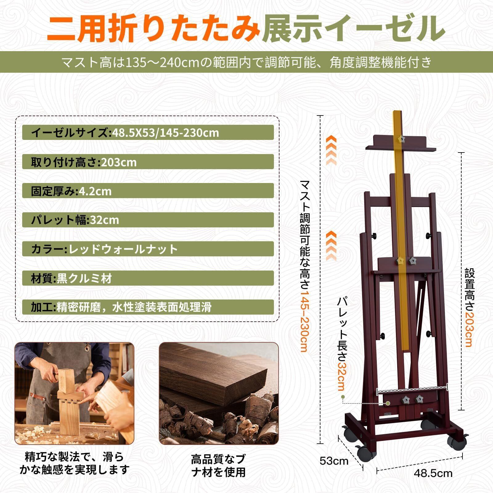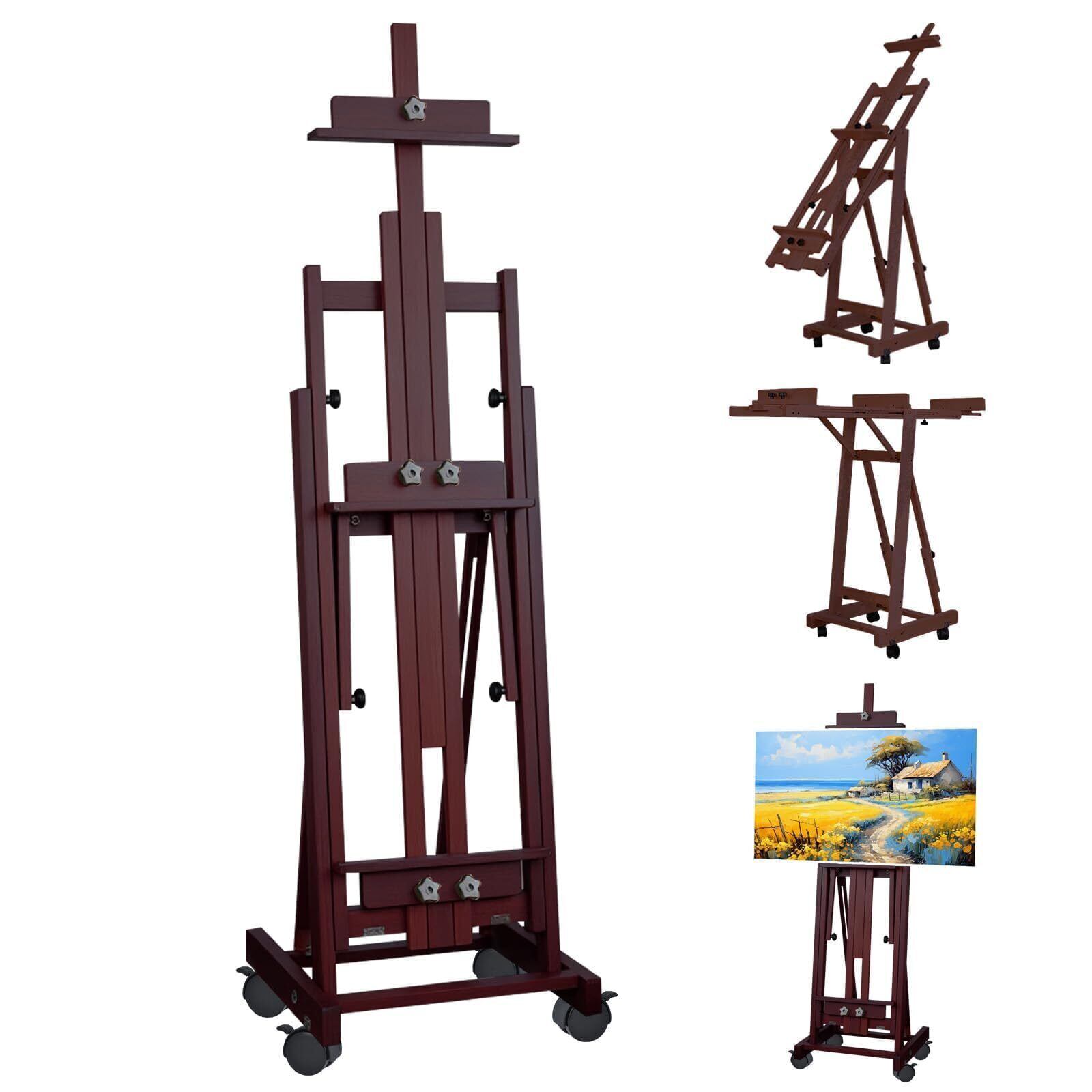 イーゼル ブナ木製 145-230cm 角度調節 Hフレーム キャスター付き イーゼルスタンド 水平・垂直両用 画架 頑丈 安定性高い 多機能 折りたたみ収納 スタジオ スケッチ デッサン 美術 芸術 絵画 写生 スタンド 学生 大人 ブラックウォルナット色 レトロ調 日本語説明書付き