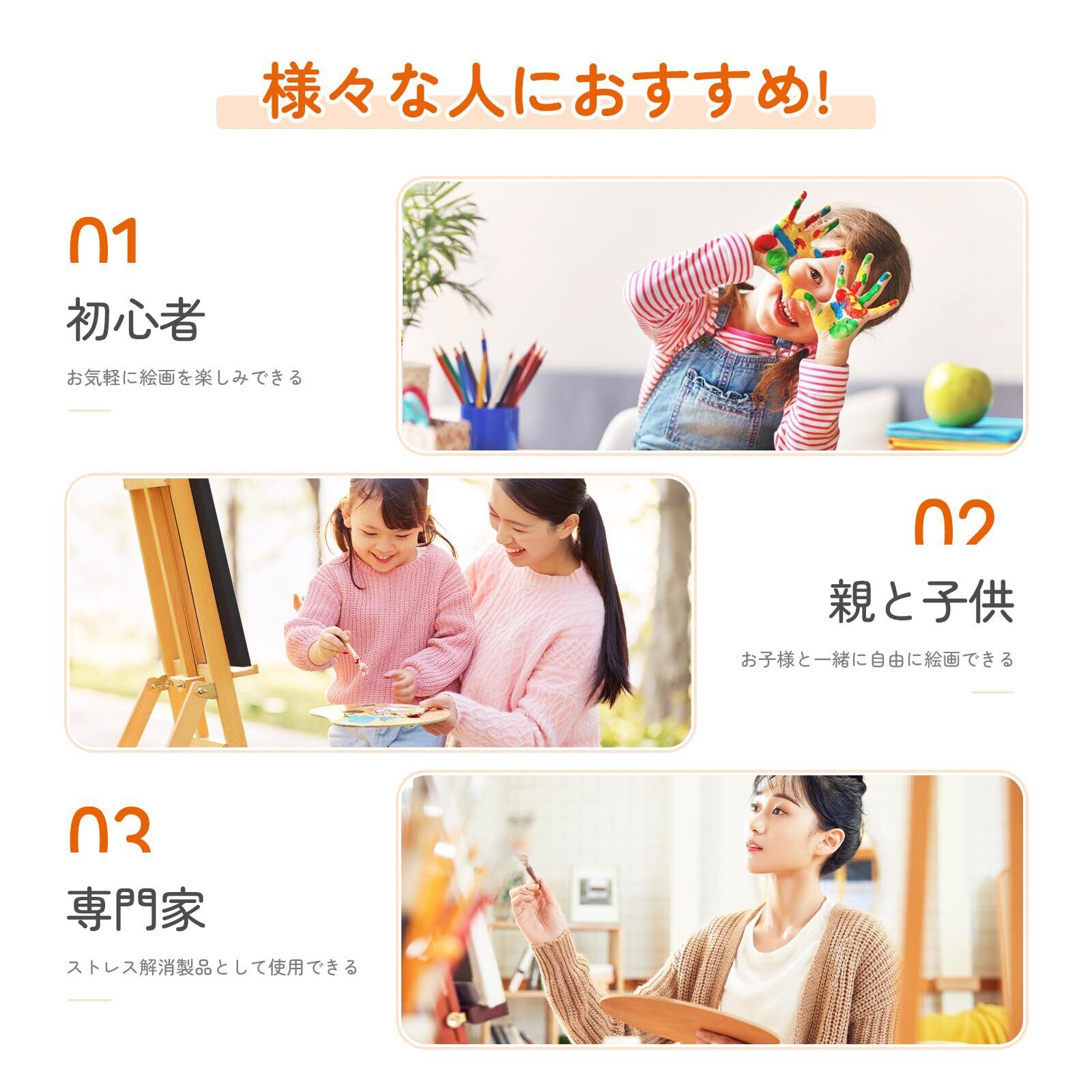 【ストレス発散及び暇つぶし】キャンバスの面積が狭いので、サラリーマン達のストレス発散の用品として、結構おすすめです。素人でも絵の具の浪費を心配せずに、お気軽に絵画を楽しみできます。またお年寄りはお一人の場合、ご趣味を養うと同時に、暇つぶしとして、本製品も大変おすすめです。