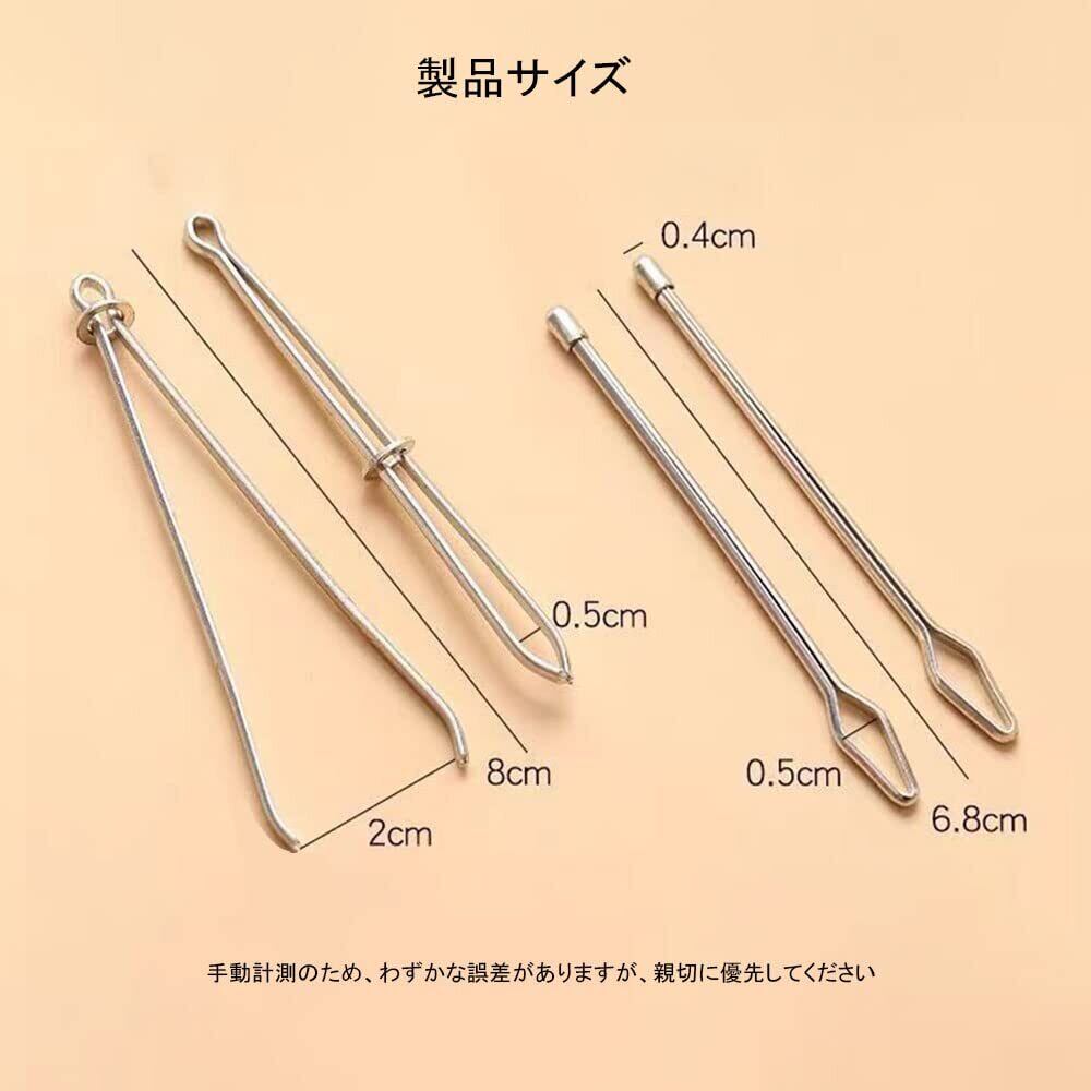 1.【サイズ】はさみ式の長さ約8cm、玉付の長さ約6.8cm 2.【パッケージ】2本セット(はさみ式ひも通し×1、玉付ひも通し×1) 3.【使用簡単】はさみ式のひも通しには小さなリングが備わっており、位置を調整でき、はさみの部分で糸をつかむことができます。玉付のひも通しは内側に糸を通して使用するタイプとなっています。 4.【幅広い適用性】2種類の糸通しは、パーカー、トラックパンツ、巾着袋など、さまざまな糸通しのニーズを満たすことができます。DIYの手作りに最適、便利な手芸用品です。 5.【抜けた紐やゴム直しをに復活】ズボンやパジャマから抜けた紐・ゴムの補修に便利。誰でも簡単に使えてスムーズに復活できます。「なかなか通らない」そんなストレスからの解放。