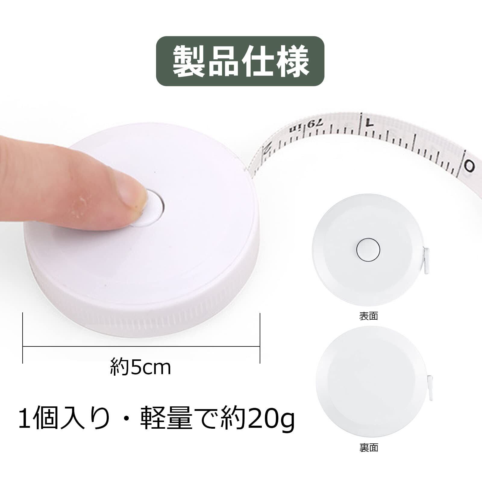 【自動巻取式・両面目盛】 この測定用巻尺は自動巻取式メジャーなので、真ん中の巻取りボタンを押すと、テープをシュッと自動的に巻き取ります。巻取りボタンを押したままでスムーズに引っ張り出し、引き出したところでボタンを離してからストップできます。裁縫用メジャーは測定単位が2つあり、片側にセンチメートルで、裏側にインチ単位で正確に印刷します。両面表記で、最大200cm(79inch)まで計測できます。