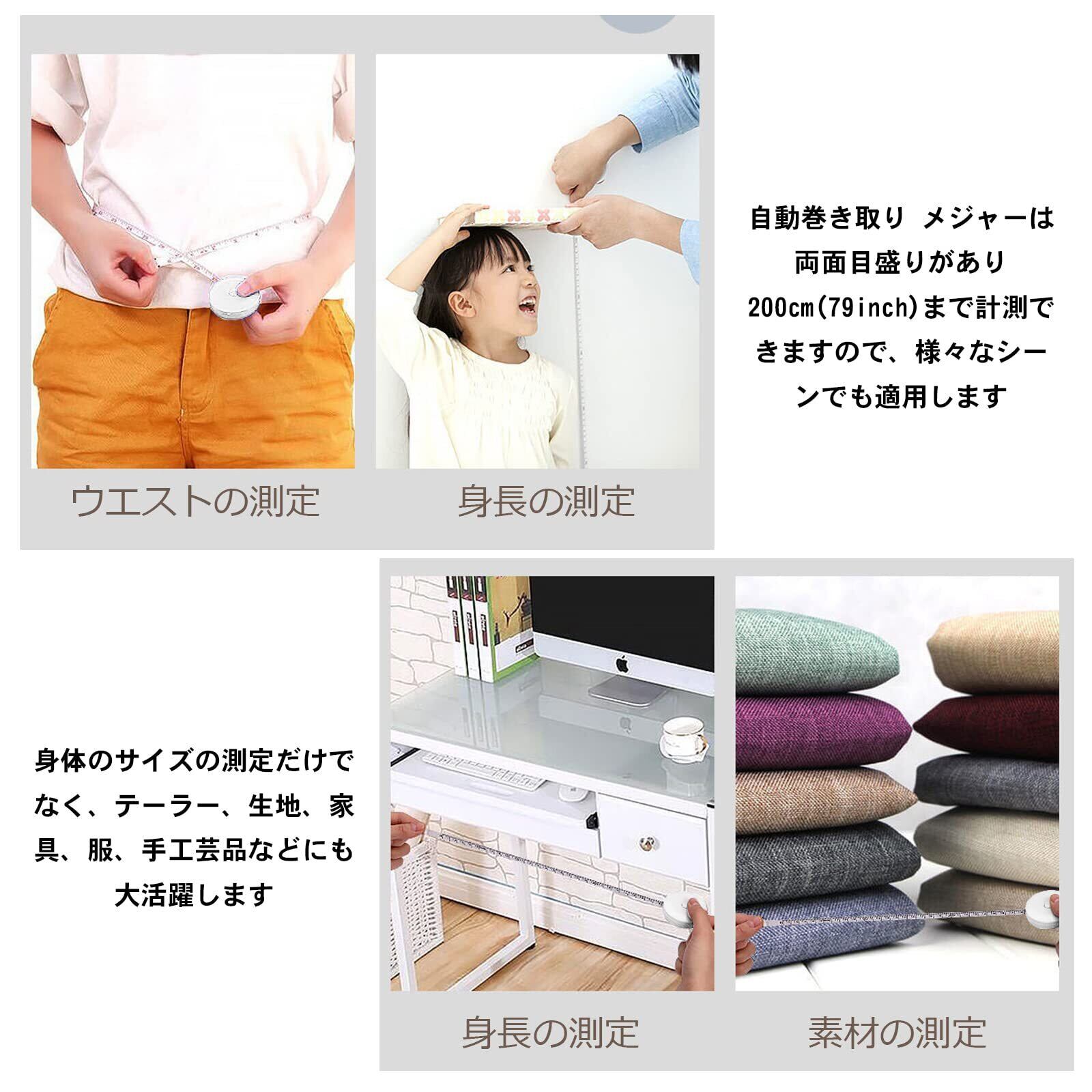 【幅広い使用範囲】 メジャー 巻き尺は両面目盛りがあり、200cm(79inch)まで計測できますので、様々なシーンでも適用します。ウエスト、ヒップ、バスト、頭囲、手首などを測るのに適用します。身体のサイズの測定だけでなく、テーラー、家具、生地、服、手工芸品などにも大活躍します。巻尺の素材は柔らかいので、形状アイテムがどんなものであっても測定でき、周囲測定の時に重宝します。