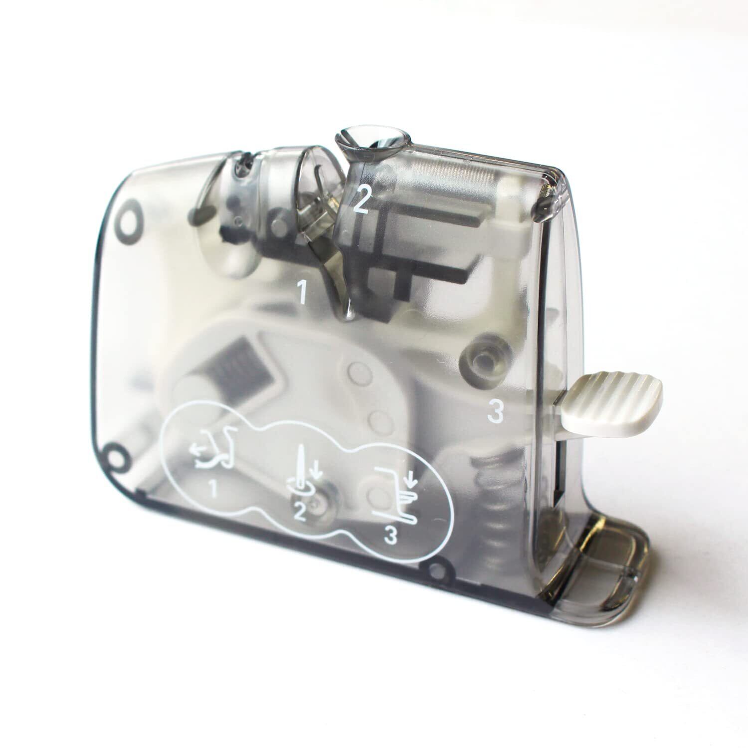 新タイプ「クイック」糸端が通り抜ける新機構で、ワンプッシュで楽々糸通しデスクスレダーは、細針~太針まで全ての穴位置を正確にとらえるよう設計されています。