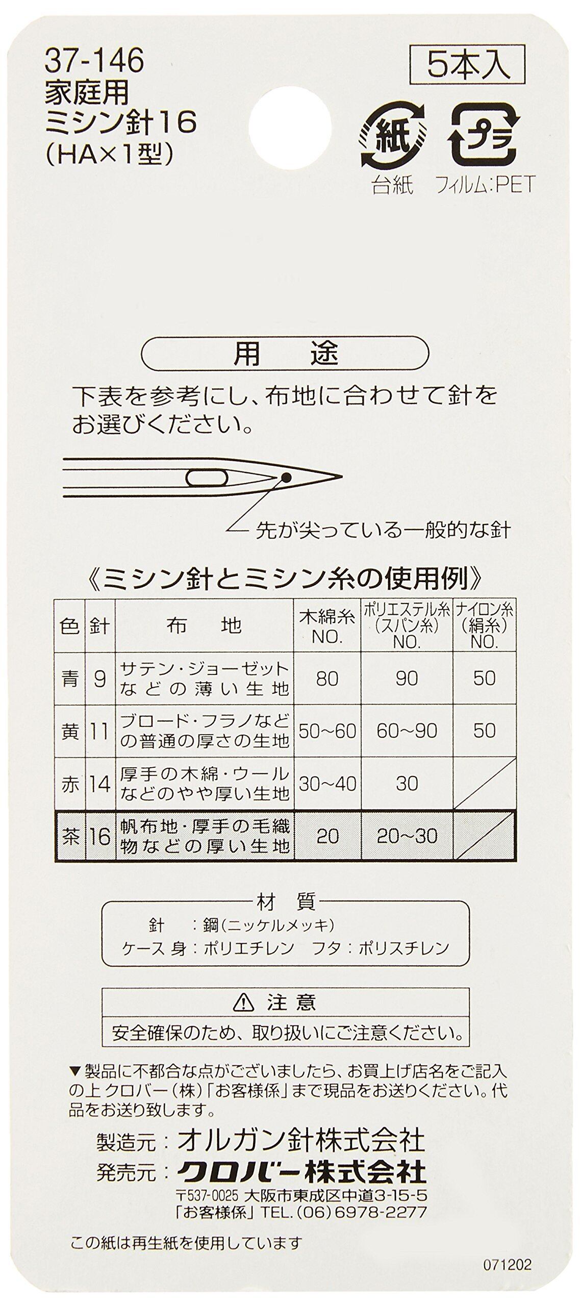 Clover 家庭用ミシン針 16 厚い生地用 5本入り 37-146