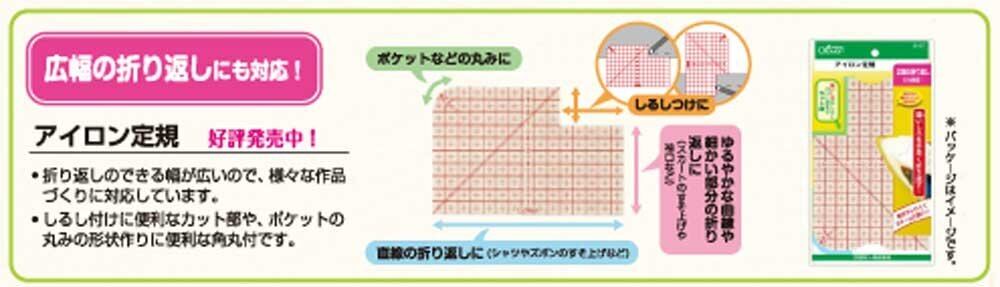 ●裾上げや三つ折りなど、布の折り返しを手早く簡単にすることができます。●印つけに。●ゆるやかな曲線の折り上げに。(スカートの裾上げなど)ポケットなどの丸みに。●長い直線の折り上げに(シャツやズボンの裾上げなど)