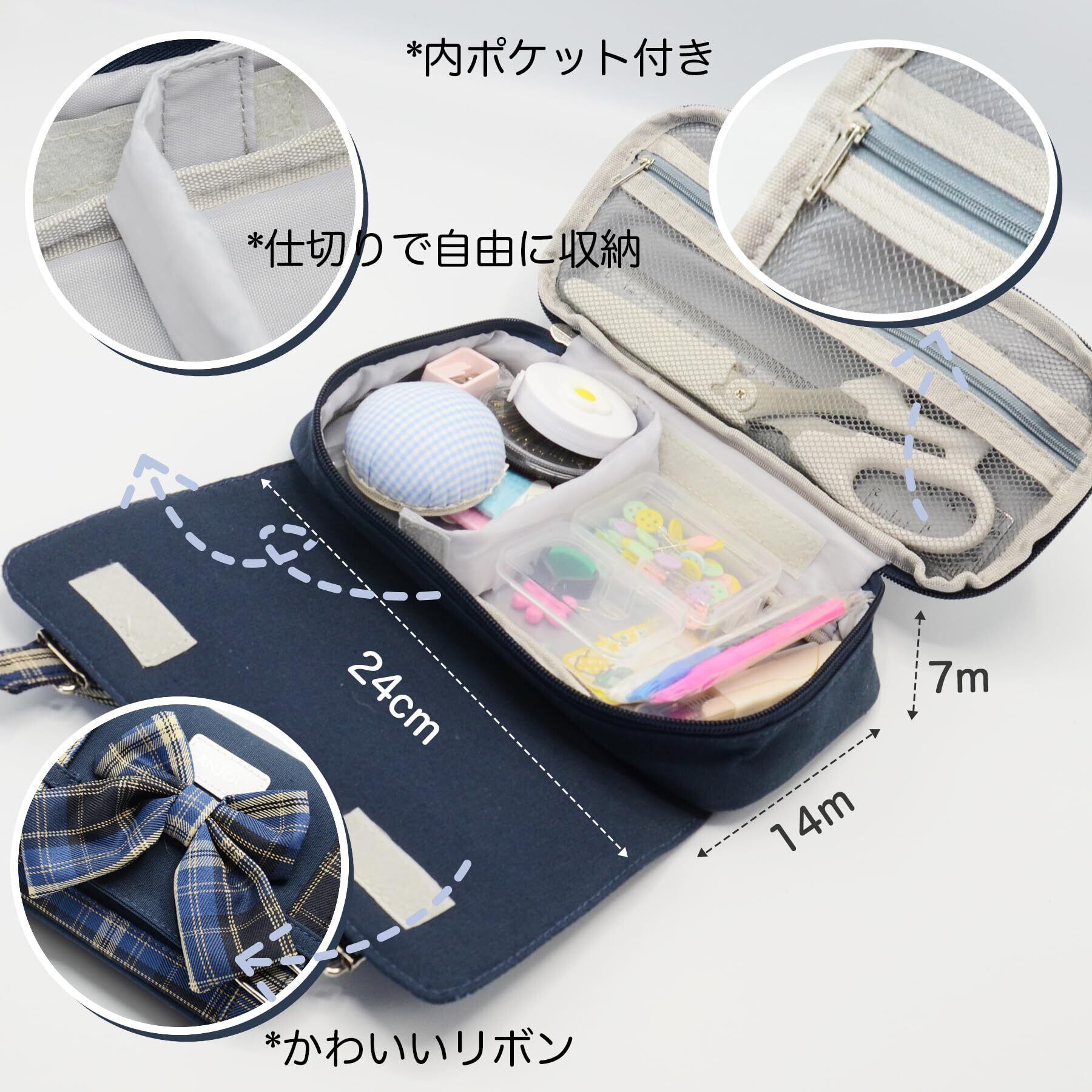 裁縫セット さいほうセット 小学生 裁縫箱 ソーイングセット 女の子 JK風 リボン携帯便利 (ネイビー)