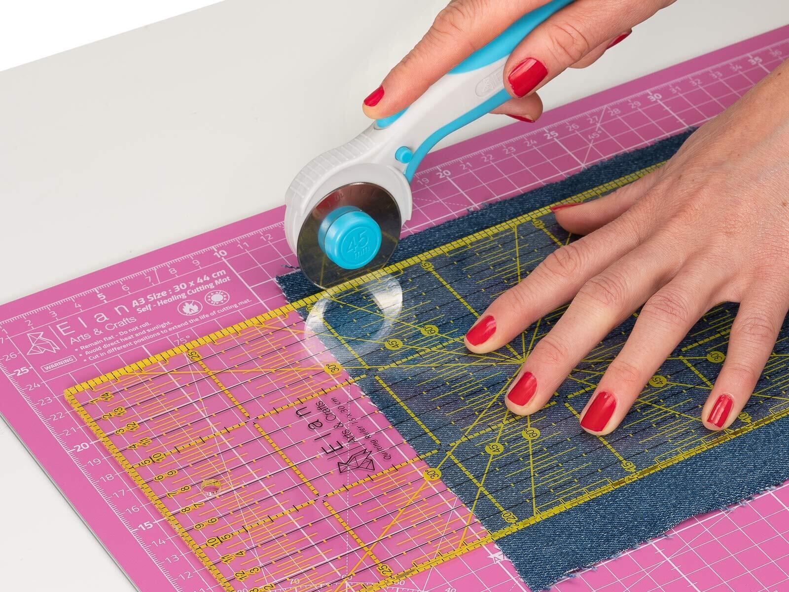 ELAN ブルーロータリーカッター - 布用カッター、ソーイングロータリーカッター、45mmロータリーカッター刃、キルティングツール。使いやすく、右利きでも左利きでも安全。グリーン、ブルー、ピンクの3色展開。