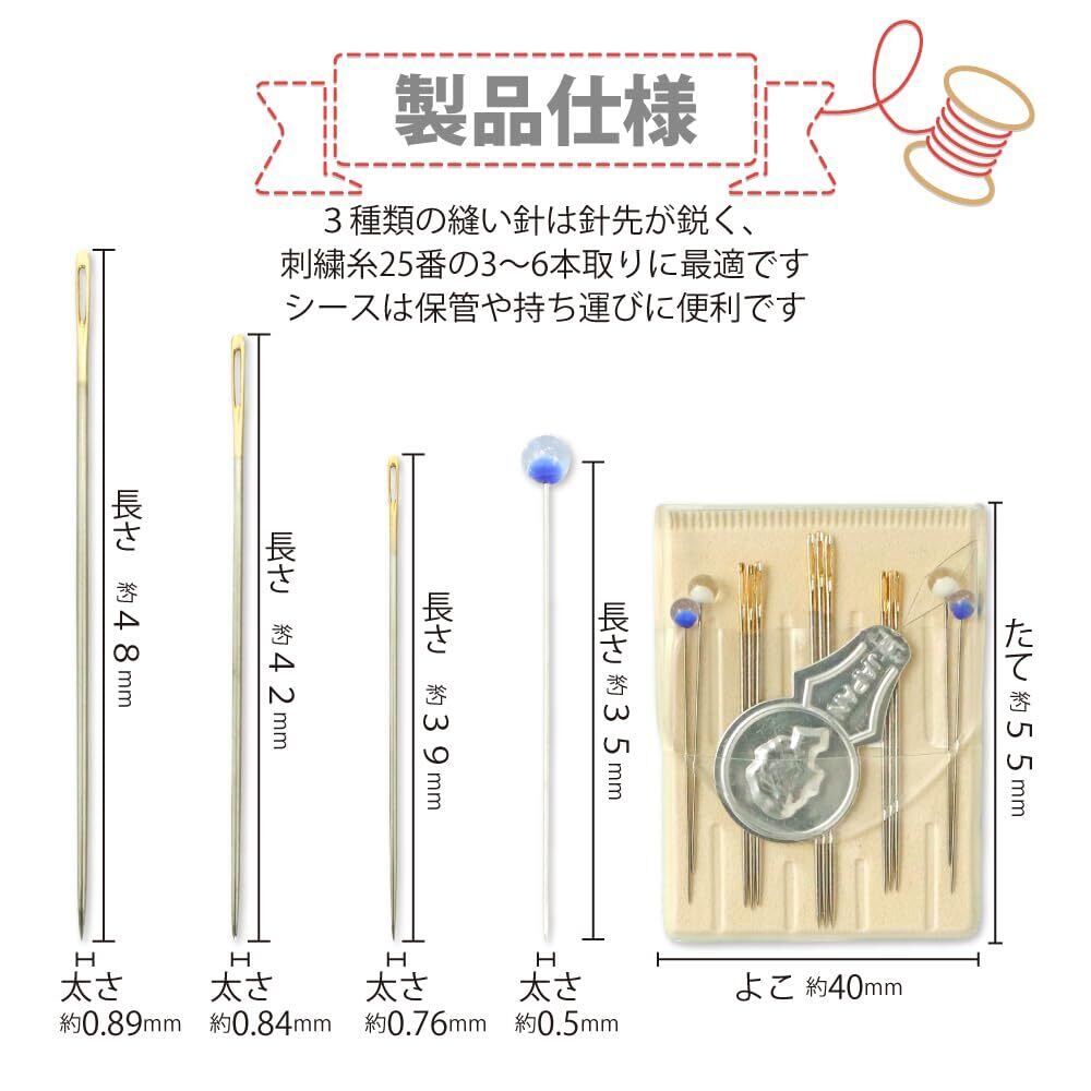 針サイズ:長さ42mm×太さ0.84mm 3本入;刺繍糸25番の4~5本取りに最適な針サイズです。