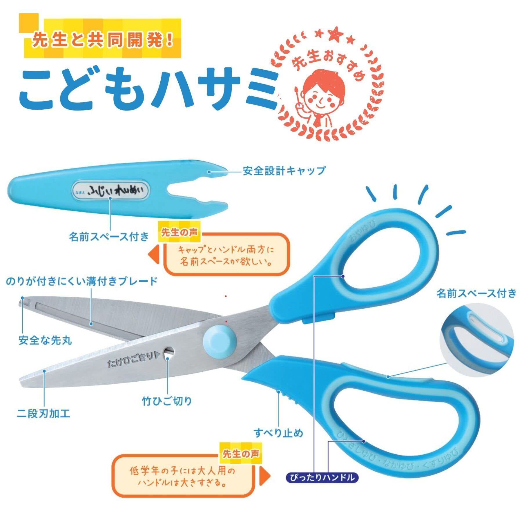 学校の先生と共同開発した学童用はさみ。指にぴったりフィットするはさみ。左利き用。人間工学データを元にハンドルを設計し,低学年から高学年まで使用できます。