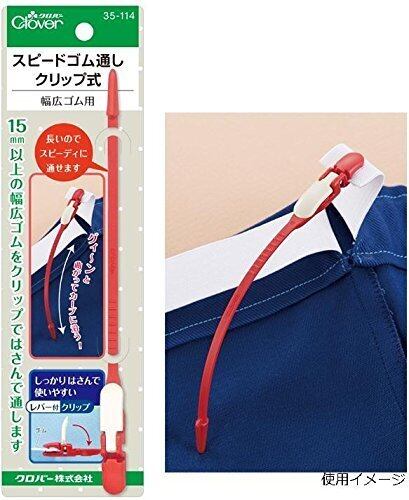 15mm以上の幅広ゴムを、クリップでしっかりはさんですばやく通せるゴム通しです。