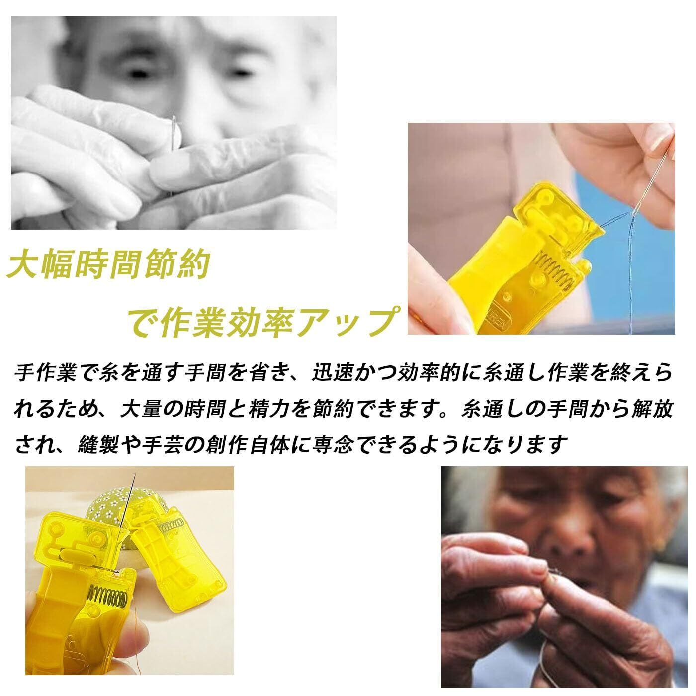 大幅時間節約で作業効率アップ:手作業で糸を通す手間を省き、迅速かつ効率的に糸通し作業を終えられるため、大量の時間と精力を節約できます。糸通しの手間から解放され、縫製や手芸の創作自体に専念できるようになります