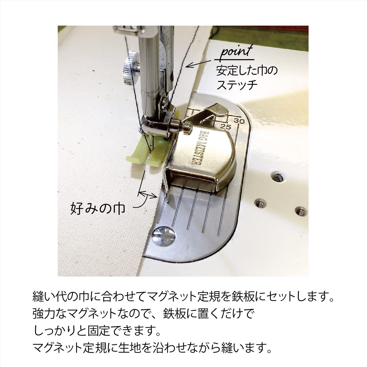 ミシンの鉄板に付けることで、生地を定規に沿わせながら安定した巾で縫うことができます。