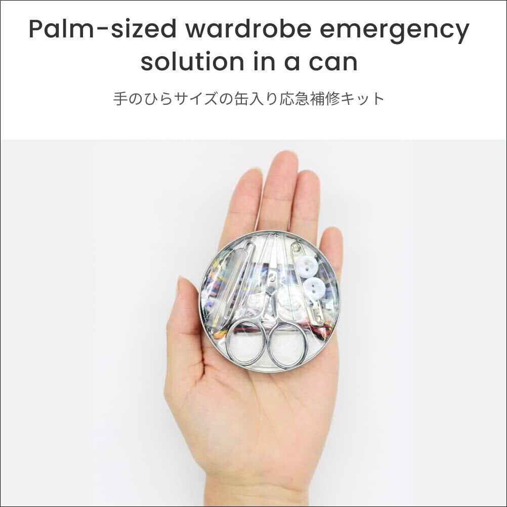 【手のひらサイズの缶入り応急補修キット】約たまご1個分の軽さ、わずか57gです!どこへでも持ち運び可能で、緊急事態に備えることができる縫製キットです。