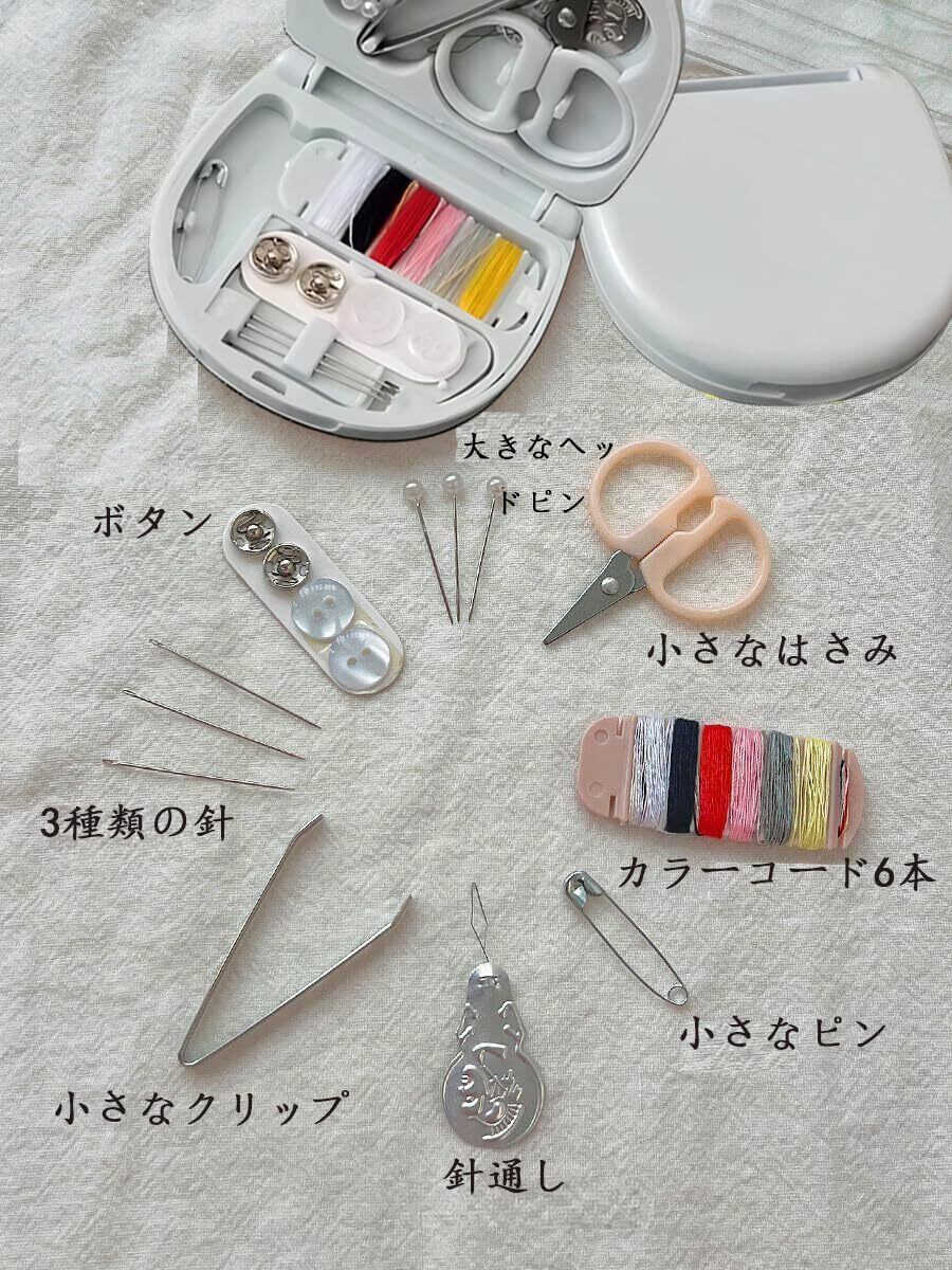【パッケージ内容】収納箱*1、縫い糸*6色、縫い針*3、安全ピン*1、スペアボタン*4、パール針*3、糸通し*1、小さなクリップ*1、はさみ*1 ;針と糸が揃っている,通常の針と糸ケースには、様々なサイズと色の針と糸が入っており、あらゆる裁縫ニーズに対応できます。
