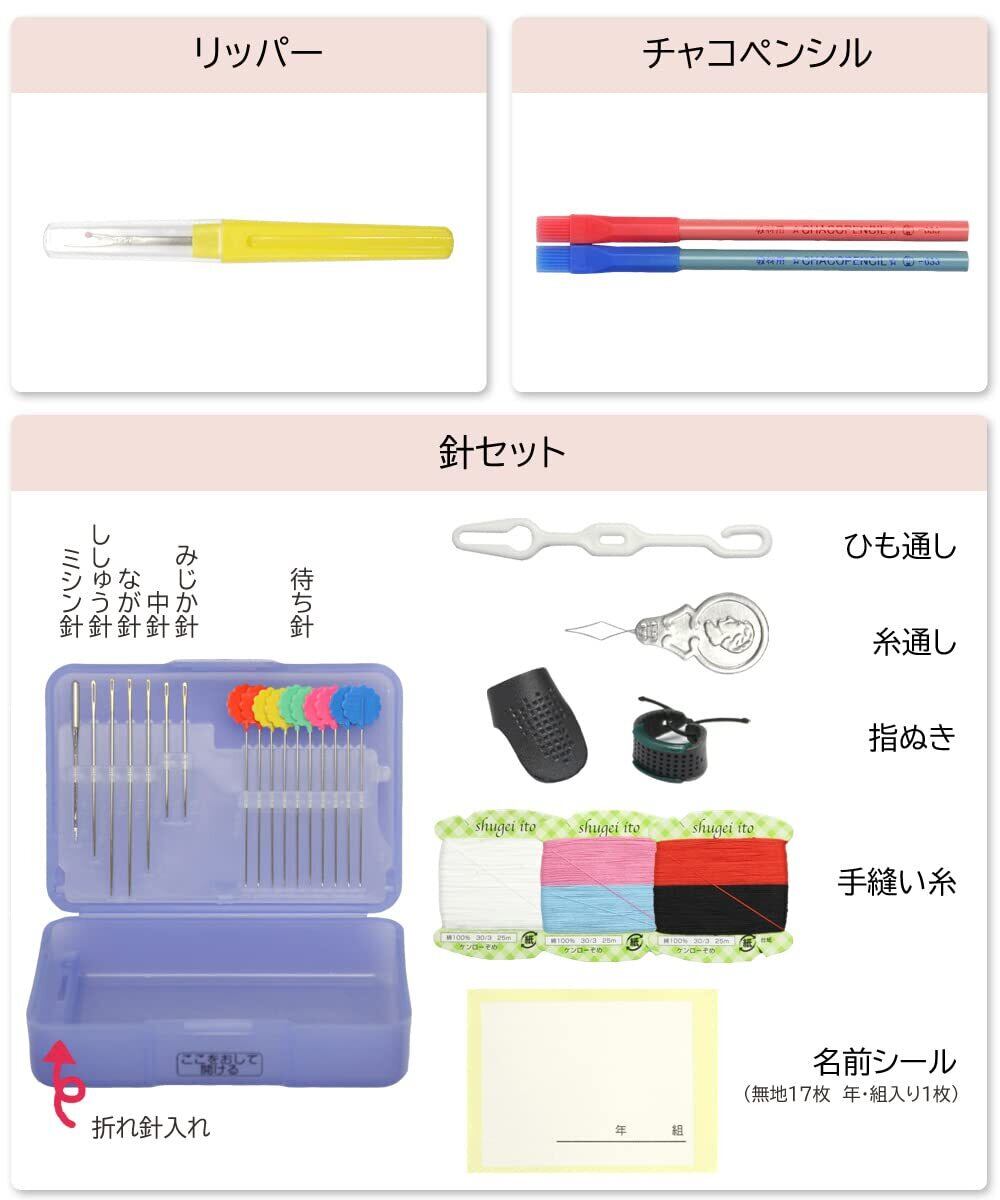 【セット内容】・裁縫バッグ ・針セット(折れ針入れ付き) なが針×2、中針×1、ししゅう針×1、みじか針×2、ミシン針×1、マチ針×10 名前シール×1、指ぬき2種、糸通し×1、ひも通し×1 手縫い糸(白25m、赤・黒・ピンク・ブルー各約12.5m) ・針山 ・リッパー ・メジャー2m ・日本製21cm裁ちばさみ(右利き、左利きは商品名をご確認ください) ・糸切りばさみ ・チャコペンシルピンク・ブルー ※はさみの刃の表面についている油は錆止め用です。ティッシュ等で軽く拭き取ってからご使用ください。