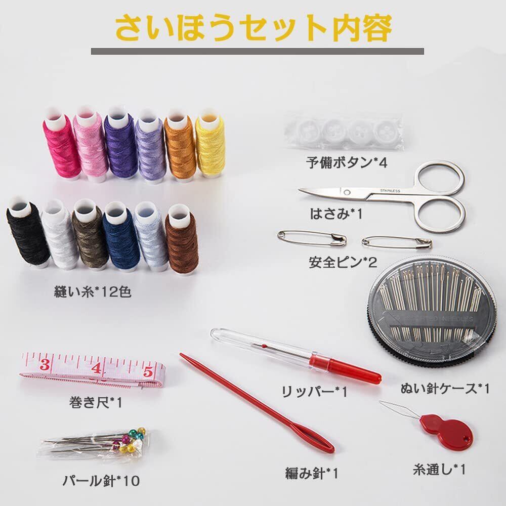 【裁縫セット内容】収納バック*1、縫い糸*12色、ぬい針ケース*1(ぬい針30個)、安全ピン*2、予備ボタン*4、パール針*10、糸通し*1、リッパー*1、メジャー*1、編み針*1、はさみ*1,10種類のツールがありますので、ほとんどの裁縫作業ができます。