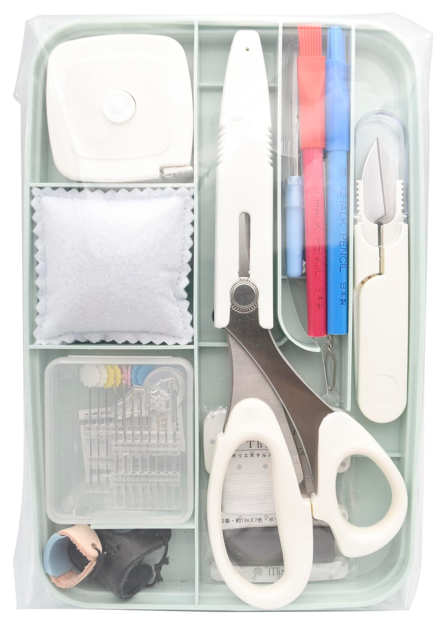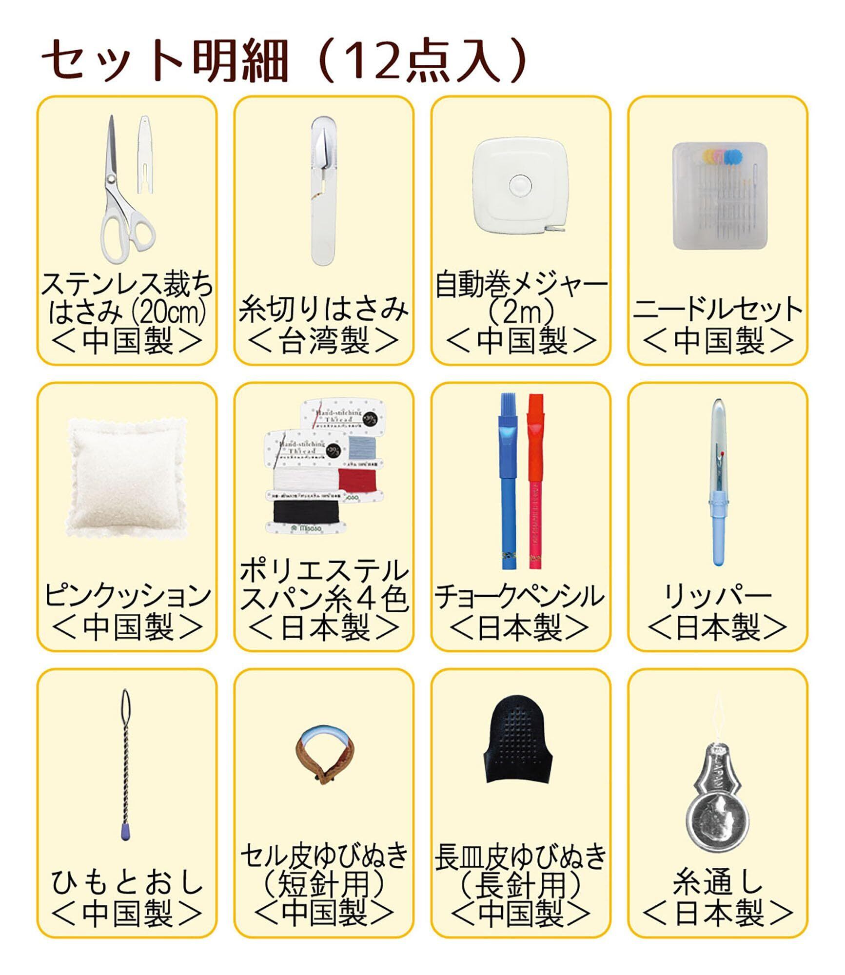 セット内容:ステンレス裁ちはさみ(20cm)、糸切りはさみ、自動巻メジャー(2m)、ニードルセット、ピンクッション、ポリエステルスパン糸4色、チョークペンシル、リッパー、ひもとおし、セル皮ゆびぬき(短針用)、長皿皮ゆびぬき(長針用)、糸通し