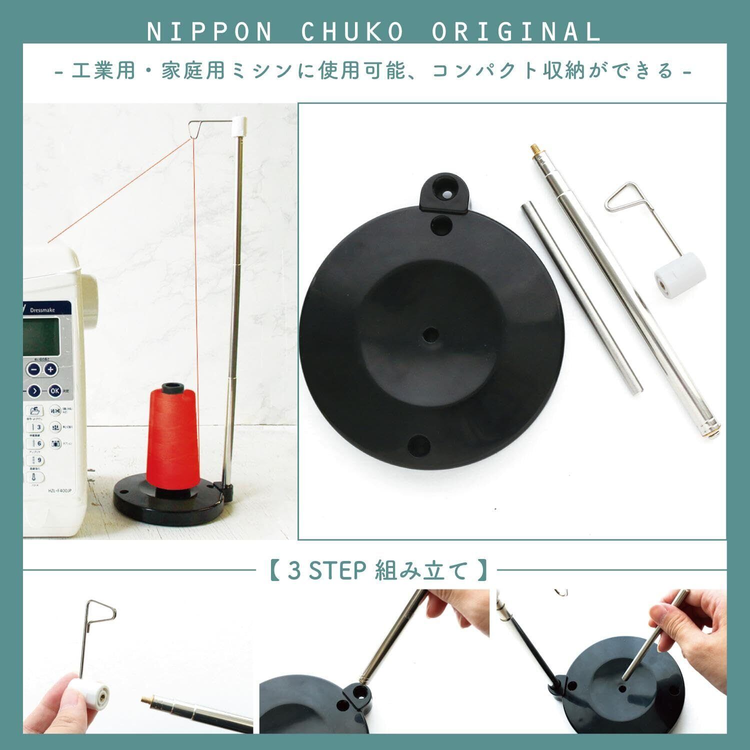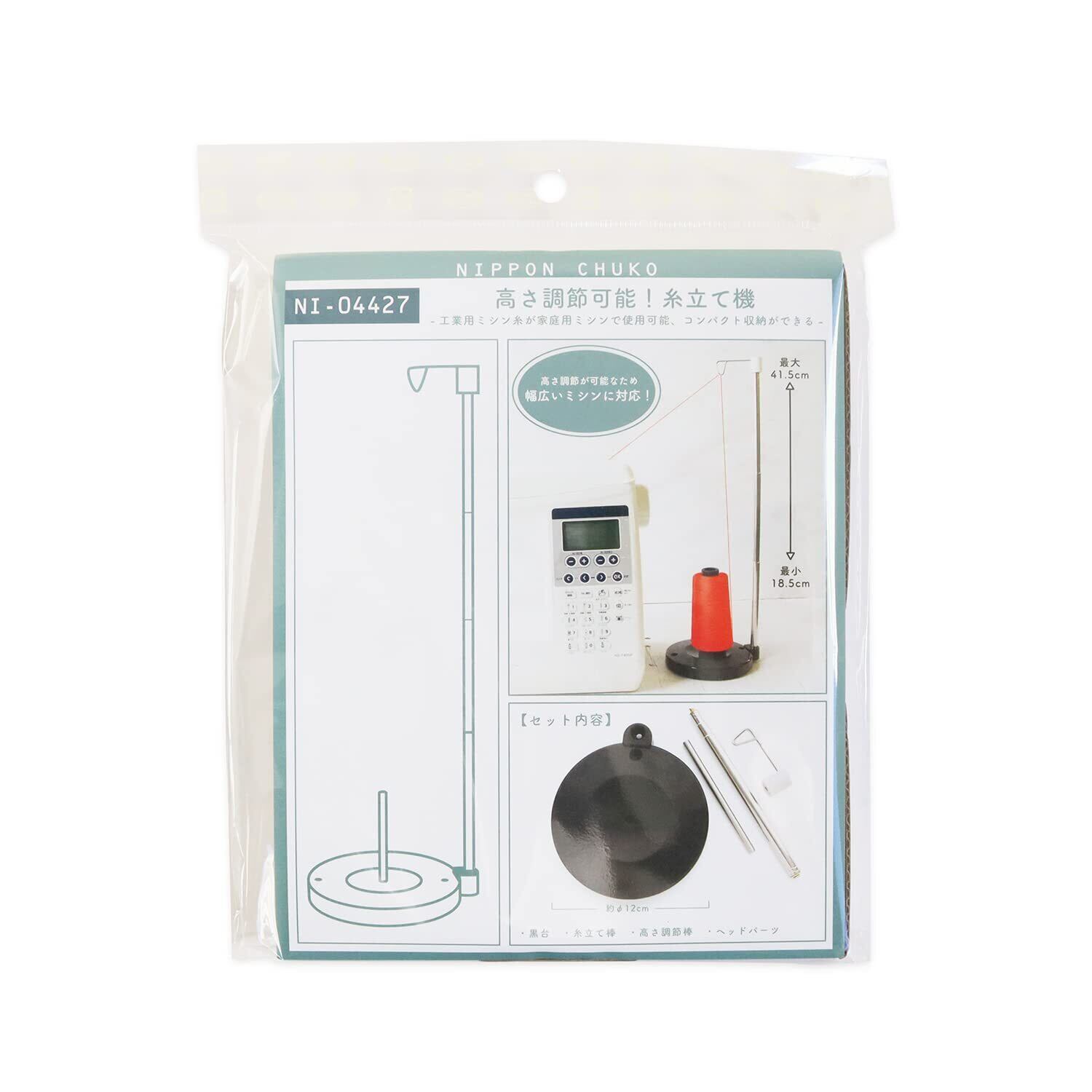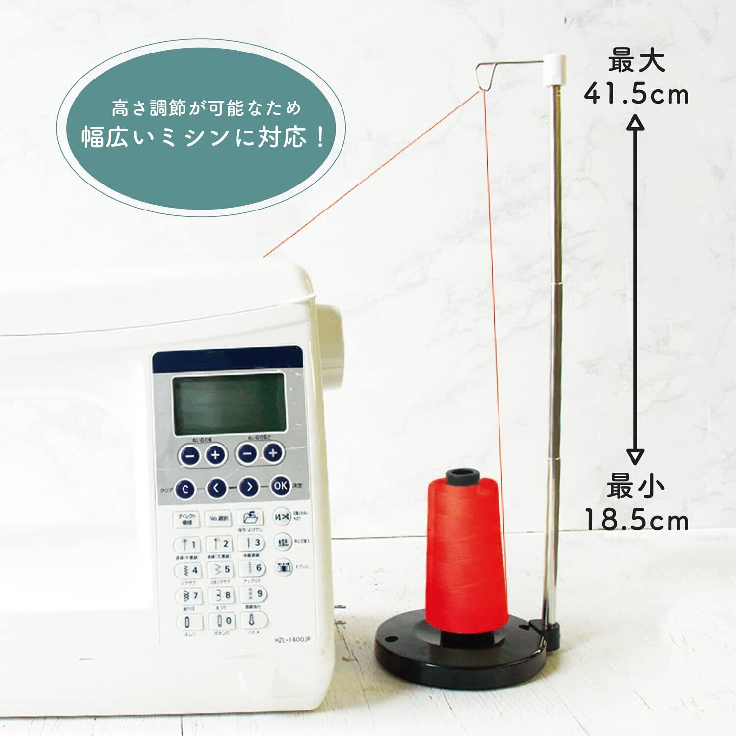 ■素材:ポリスチレン ■サイズ:約W13.5×H12cm 工業用ミシン糸を家庭用ミシンで使える優れもの! 最大41.5cm~最小18.5cmに高さ調節が可能で、組み立て式のため、 コンパクトに収納できて場所を取りません!
