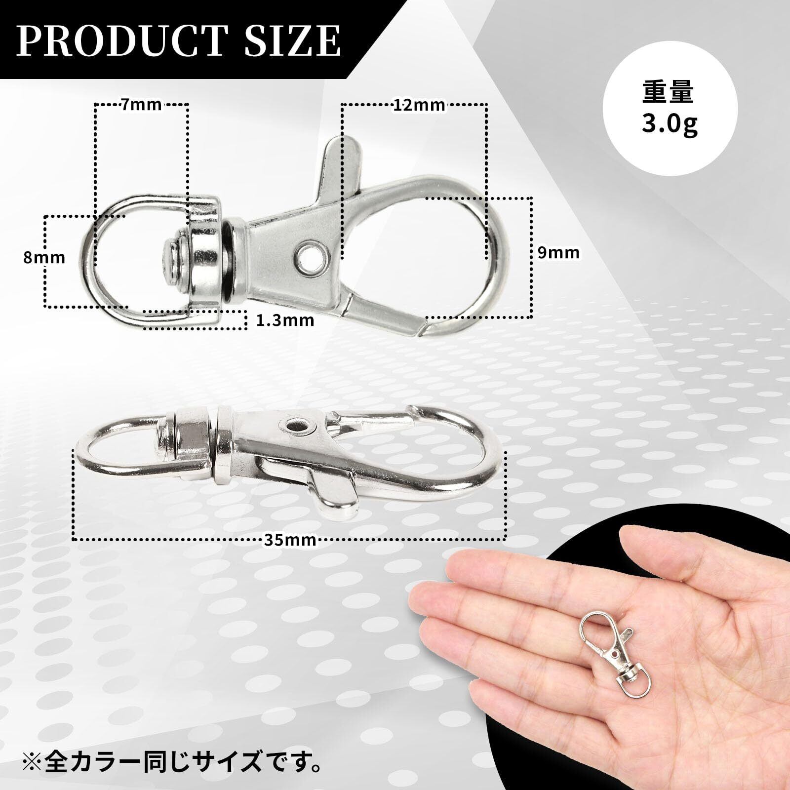 8mm、12mm、15mm、20mm、25mm、アンティークゴールド、シルバー、ライトゴールド、ブラックニッケルの4色5サイズ合計20バリエーションを展開しています。