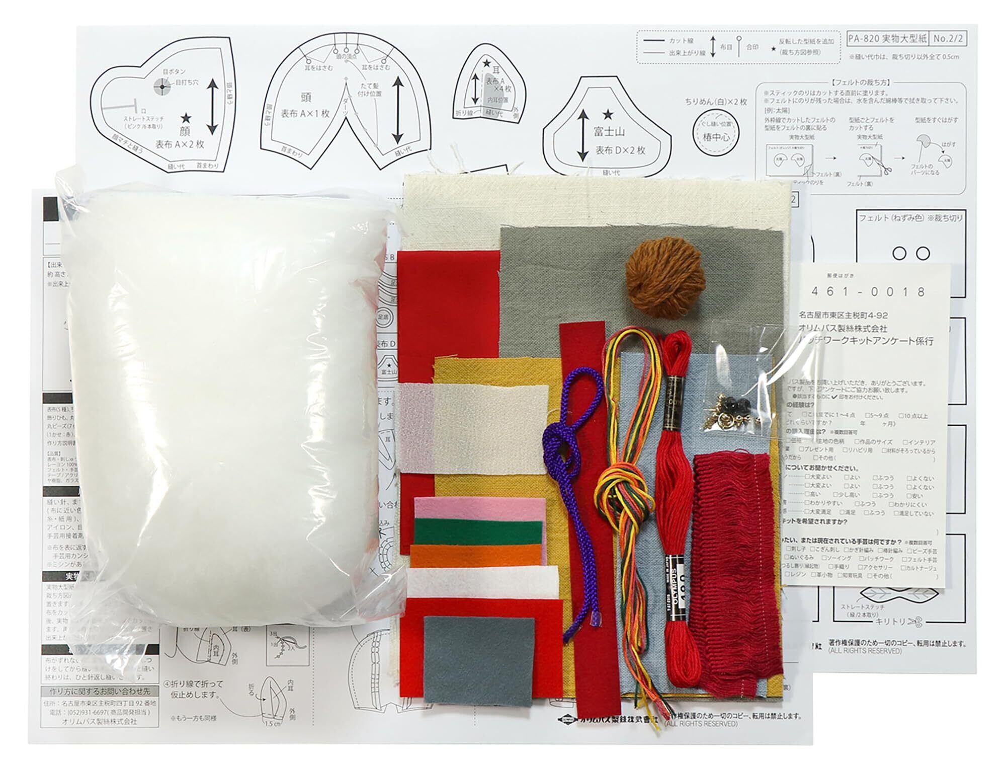 キット内容:表布、ちりめん、フェルト、毛糸、目玉ボタン、手芸用綿、飾りひも、刺しゅう糸、作り方説明書、実物大型紙、丸カン、フリンジテープ、ビーズ