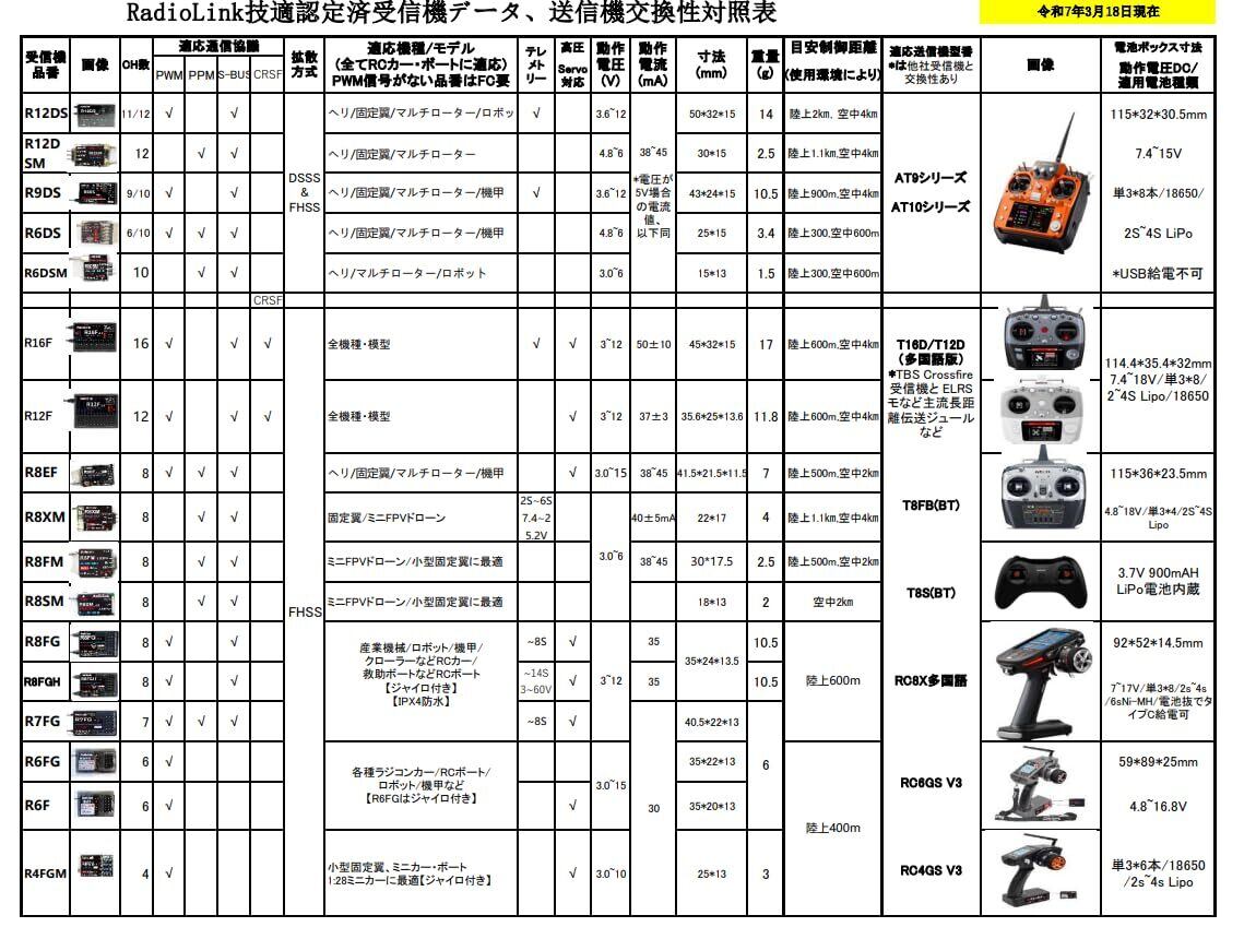 模型用(ドローンを含む)送信機に対応している当社受信機Rシリーズです(フライトコントローラーも含む)。R8FG R7FG R6FG R6F R4F R4FGMから順次公開の予定ですが、型番が多いため、寸法・対応機種・制御距離・テレメトリー機能がつくかどうかなどについてはご購入の前に必ずご確認ください。ご不明の点がございましたら弊社日本駐在員までお気軽にお問い合わせください。*当社送信機しか適用しませんのでご留意ください。