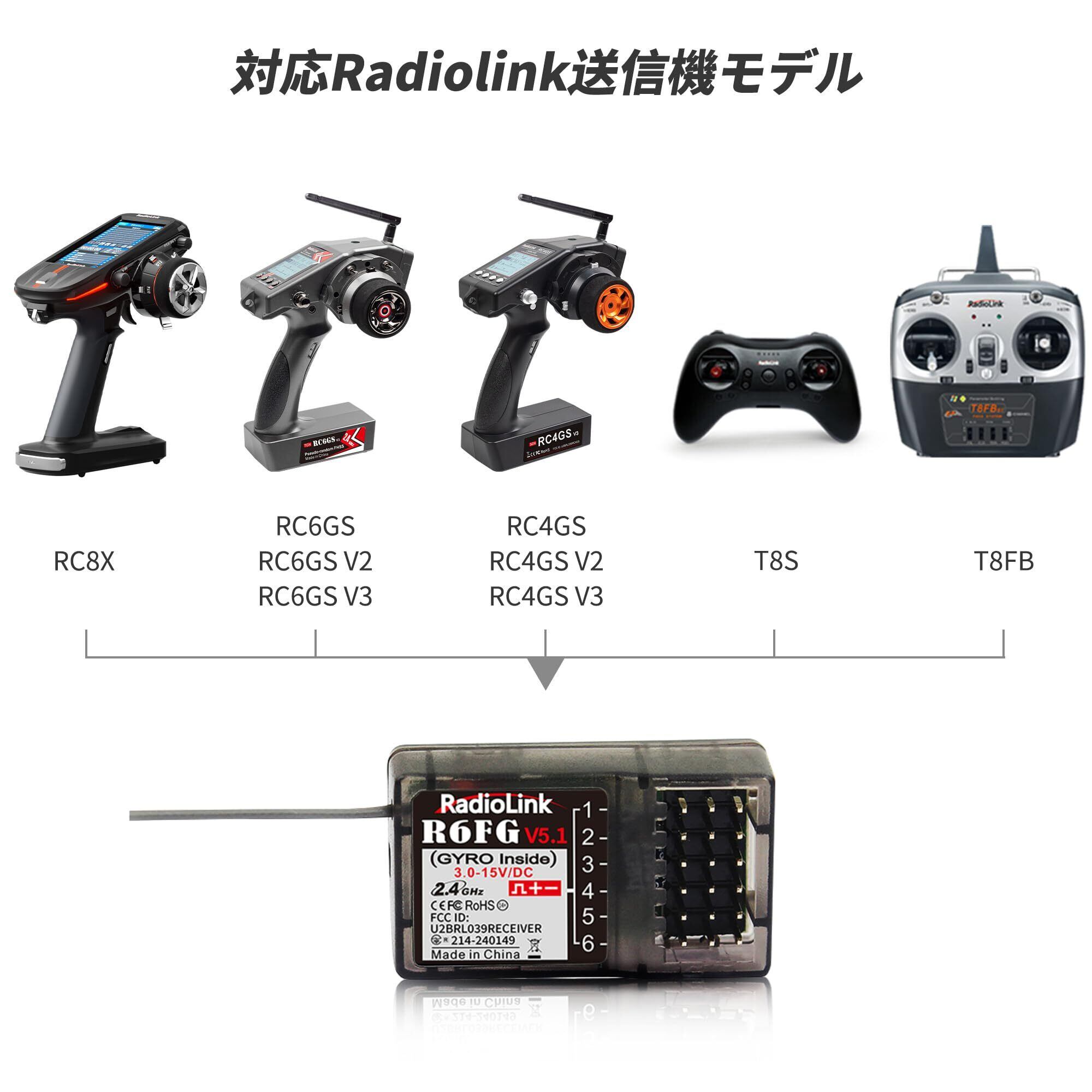 Radiolink R6FGジャイロ受信機 6チャンネル2.4GHz RC防水受信機 、電圧テレメトリー、400M長距離制御、RCクローラ漂流車、ボート用、無線コントローラーRC8X/RC6GS V3/RC4GS V3/T8S/T8FB/T16D/T12D適応