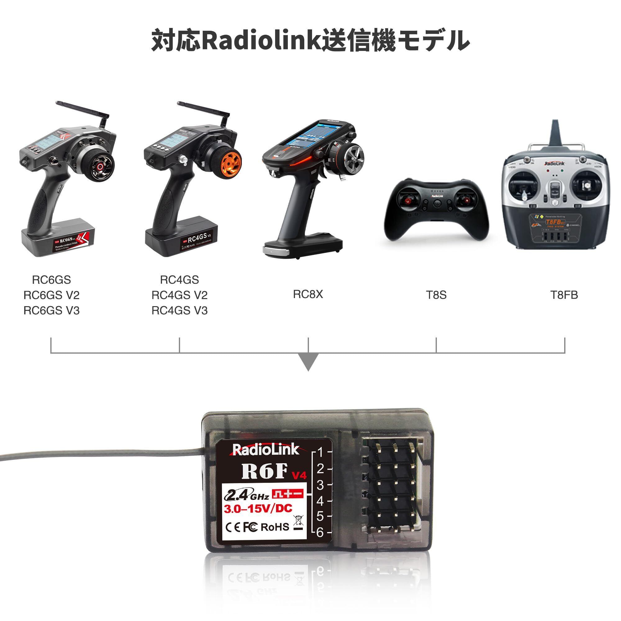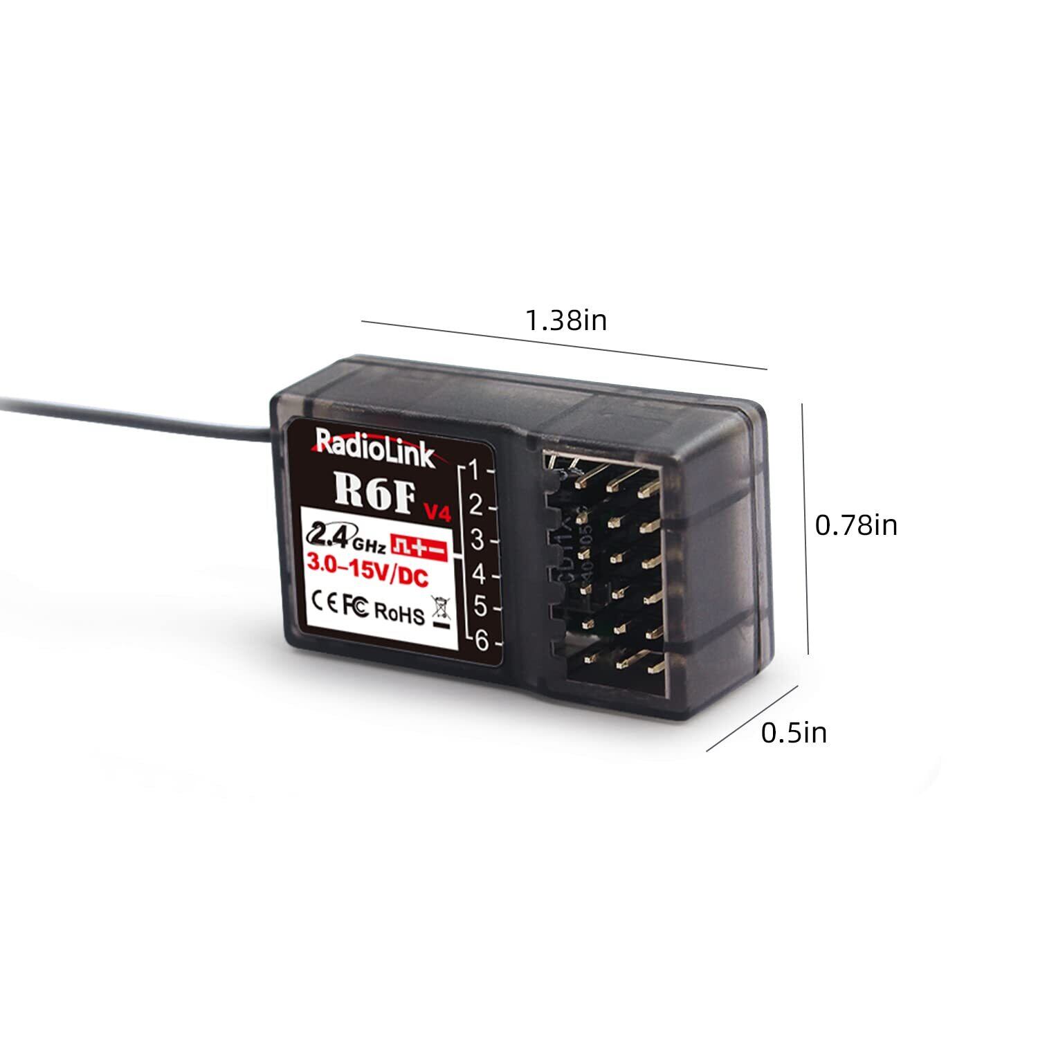 Radiolink R6F 受信機 6チャンネル 2.4GHz RC受信機 、電圧テレメトリー、400M長距離制御、RCクローラ漂流車、ボート用、無線コントローラーRC8X/RC6GS V3/RC4GS V3/T8S/T8FB/T16D/T12D適応(ジャイロなし)