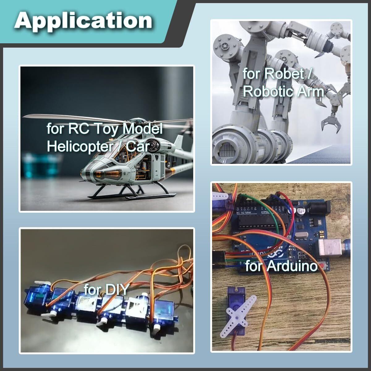 用途: SG90 9g マイクロサーボモーターは、Arduino用 / Raspberry Pi用 と互換性があり、DIY、テストに適しています。マイクロロボット、RC 玩具、模型飛行機ヘリコプター、インテリジェントカーなどに適用できます。