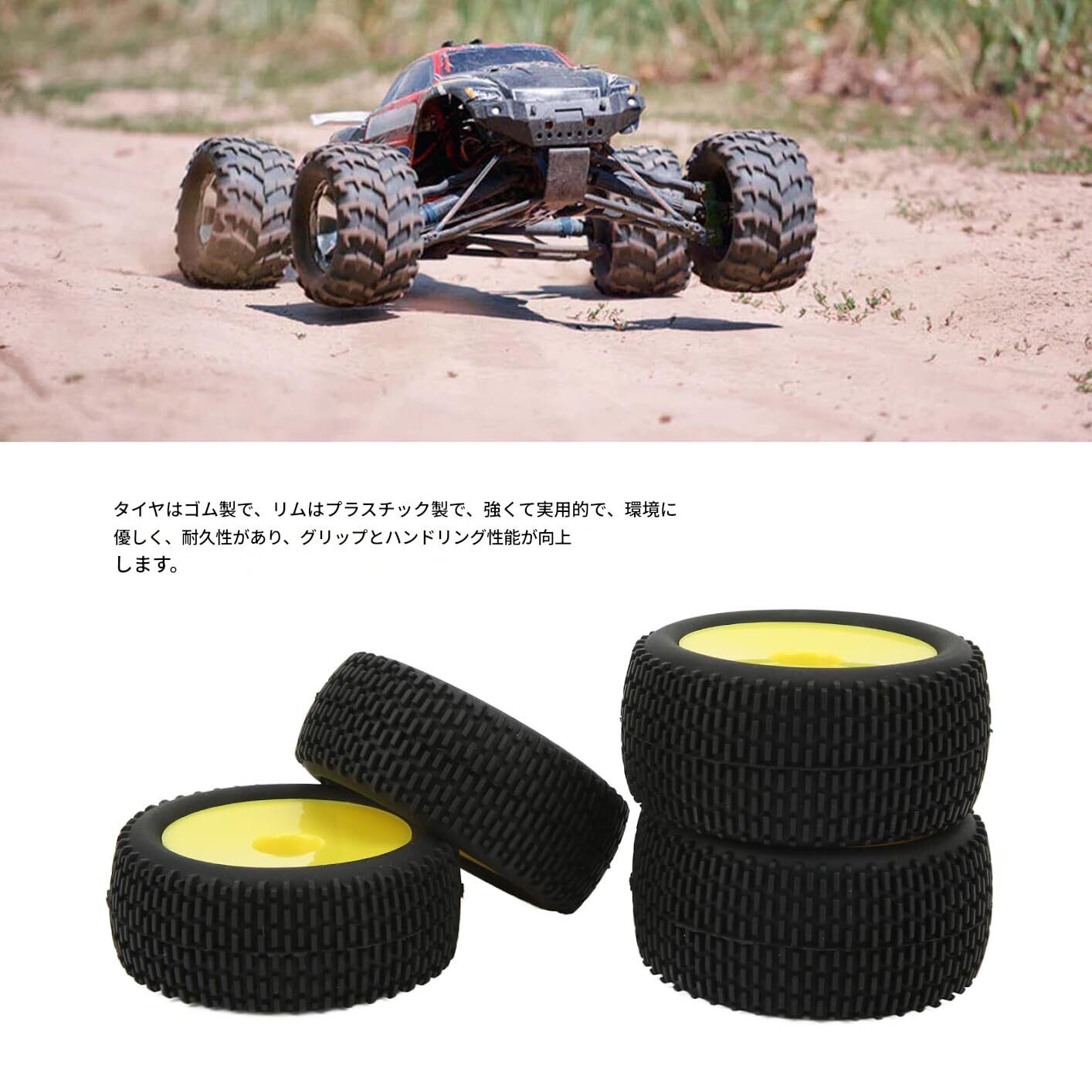 【商品仕様】素材:プラスチック、ゴム;色:黄色、黒;タイヤ直径:約88mm/3.46インチ;前輪幅:約35mm/1.38インチ;後輪幅:約42mm/1.65インチ;六角ドライブ:約12mm/0.47インチ;パッケージリスト:RCラバータイヤ4本