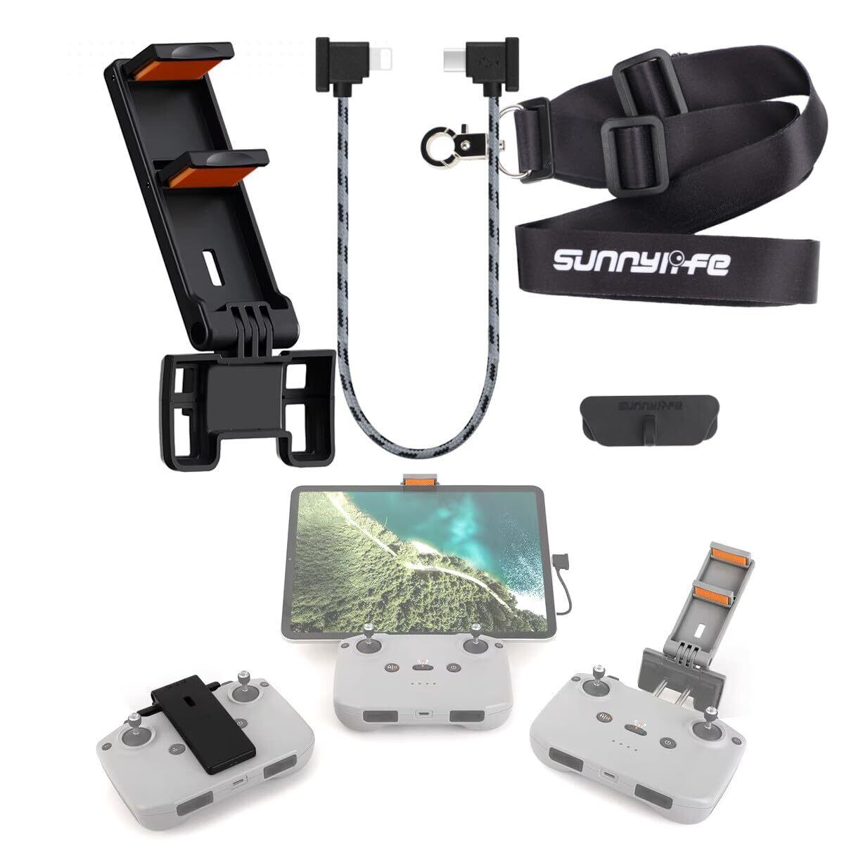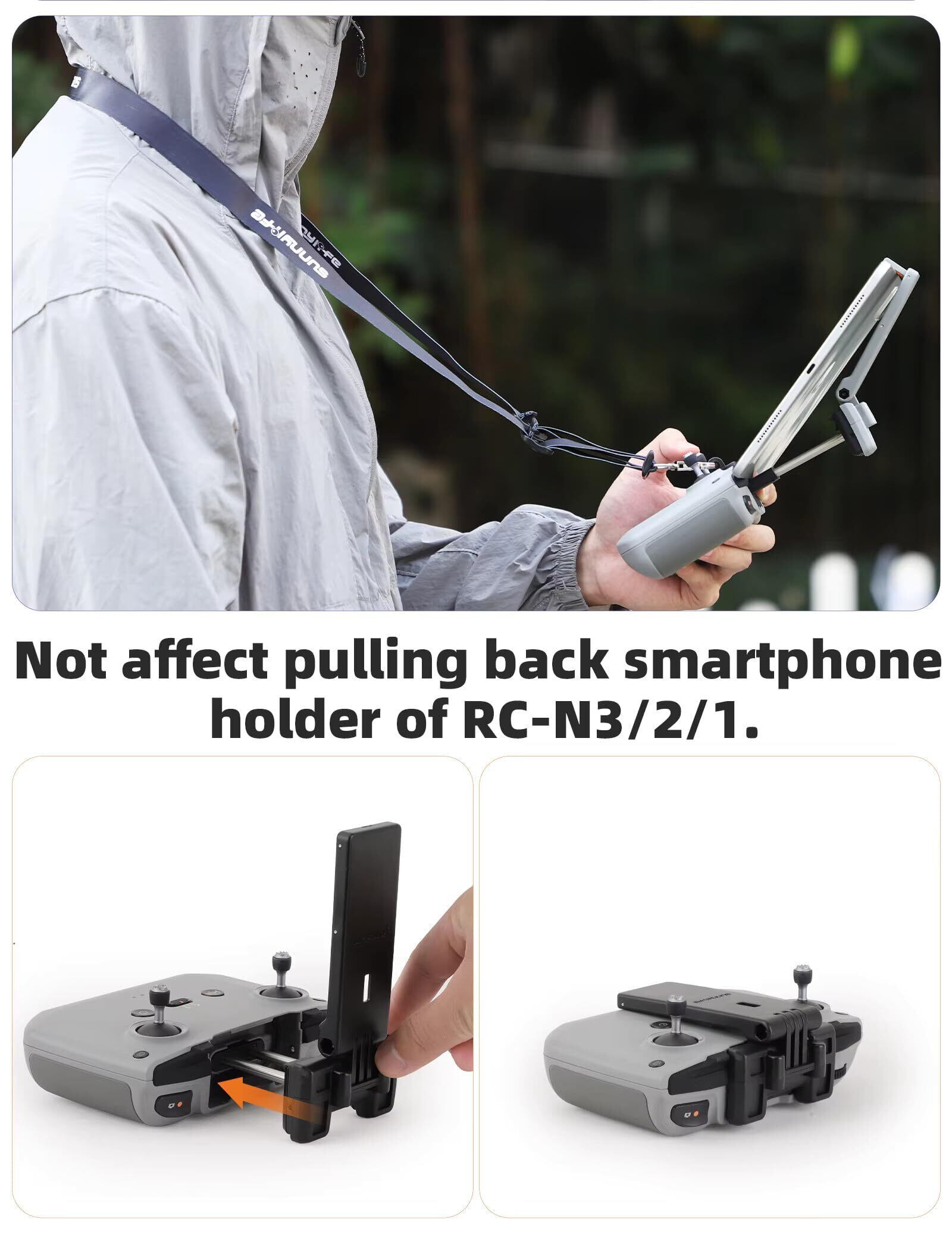 DJI送信機のRC-Nシリーズ(RC-N3/N2/N1)(Mavic3シリーズ/Air3/2シリーズ/Mini4/3/2シリーズ)でタブレット(11cm~最大18cm、厚さ約22mmまで※iPadの場合は11インチまで)を固定可能にする送信機と一体型のタブレットホルダーです。また、重くなった送信機を支えるための専用の首掛けが付属しています。