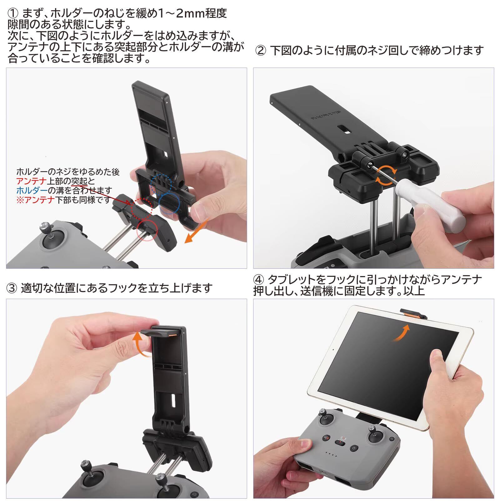 本製品の特徴:一般的なタブレットホルダーは利用するたびにホルダーを取り付ける必要がありますか、本商品では送信機アンテナをブラケットで挟み込むようにネジで固定し、ホルダー部は送信機レバー側に折りたたんで収納することができ、すばやくタブレットの利用が可能です。 ※ホルダーの角度調整はできません。ホルダーを固定した状態でアンテナは最後まで送信機内に収納できず、アンテナ部で、約2cm、送信機上部に1.5cm飛び出した状態になるので専用ケースには収納できません。