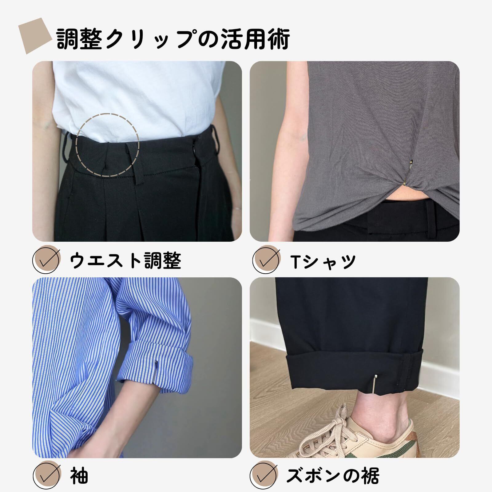 さまざまなシーンで活躍】 ジーンズやスカートのウエスト調整はもちろん、袖や裾の仮止め、ワンピースのフィット感調整にも活用可能。体型変化のある時期や制服の調整など、幅広く使える便利アイテムです。