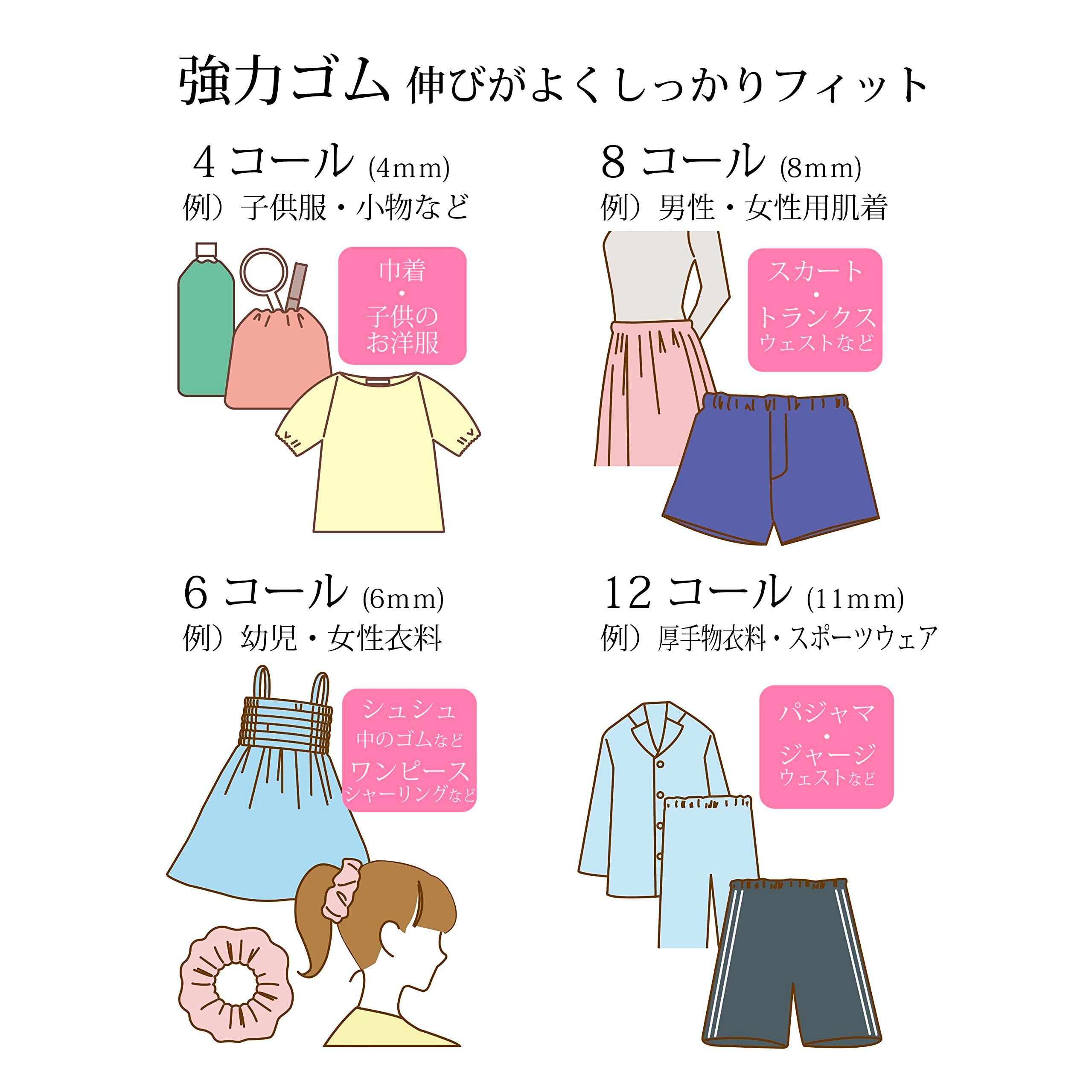 合成ゴムを使用した平ゴムです。 耐久性に優れており、洗濯にも強いのが特徴。