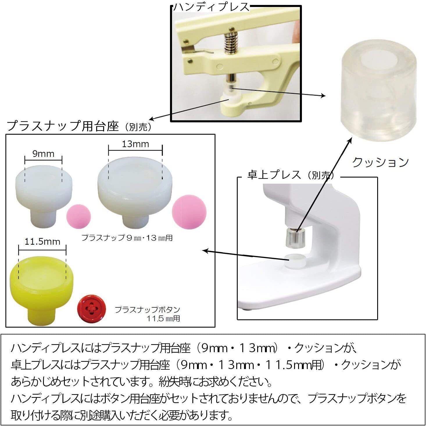 セット内容:ハンディプレス、9ミリ用台座、13ミリ用台座、クッション付
