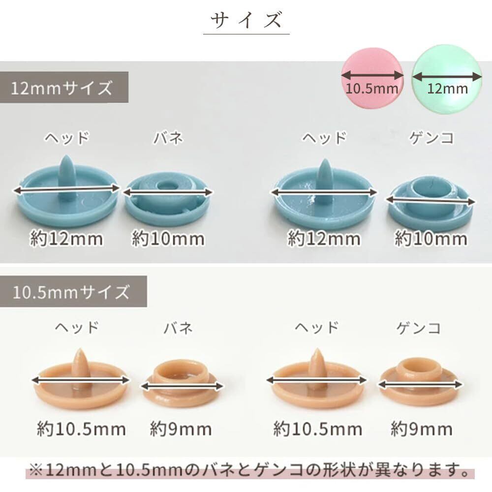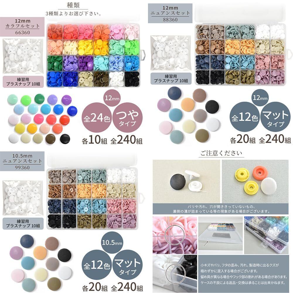 【セット内容】12mmカラフルセット:全24色×各 約10組 計240組セット、12mmニュアンスセット:全12色×各 約20組 計240組セット、10.5mmニュアンスセット:全12色×各 約20組 計240組セット組分、取り付け方法の説明書付き、練習用プラスナップ10組付き ※10.5mmサイズのみ各1組ずつ予備としてお入れしております。※パッキングは手作業で1色ずつ詰めていますため、個数に誤差がある場合がございます。カラーにより数量組めない場合がございますが、全部で240組入るようセットされております。※詳細は画像をご確認ください。