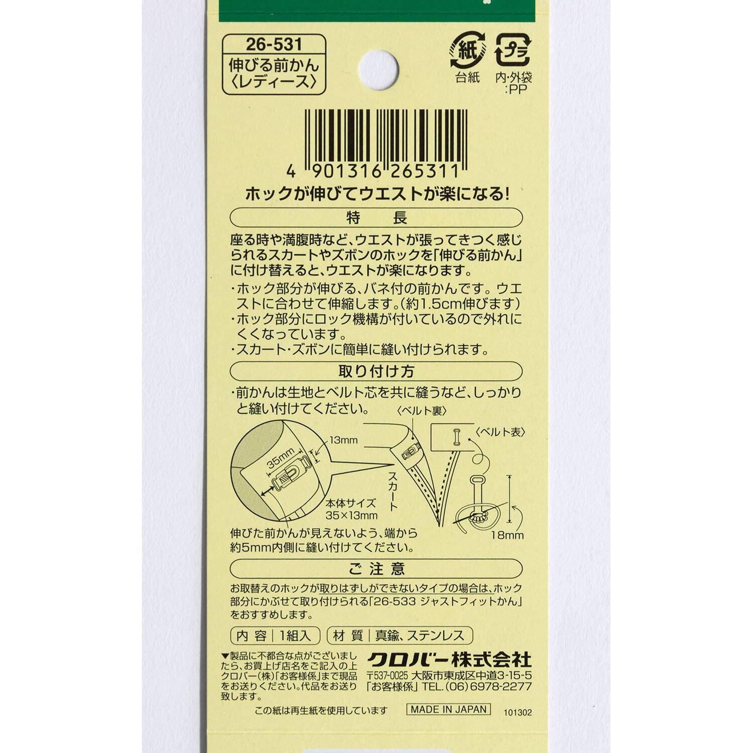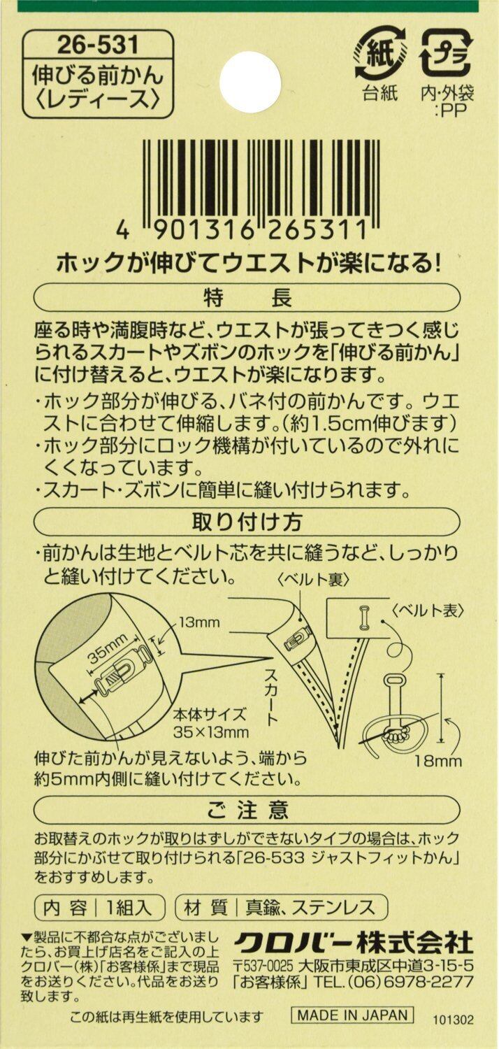 ●座る時や満腹時など、ウエストが張って少しきつく感じられるスカートやズボンに。●ホック部分が伸びる、バネ付の前かんです。ウエストに合わせて伸縮します。(約1.5cm伸びます)。●スカート・ズボンに簡単に縫い付けられます。●レディースはホック部分にロック機構が付いているので外れにくくなっています。